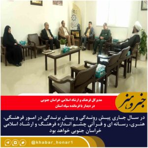 مدیرکل فرهنگ و ارشاد اسلامی خراسان جنوبی در دیدار با فرمانده سپاه استان، گفت: سیاست ما در حوزه توانمدسازی، توجه به نیرومندسازی و حمایت از جبهه های فرهنگی مردمی در حوزه های فرهنگی، هنری، رسانه ای و قرآنی می باشد. علی فرخنده اظهار کرد: تاکید مقام معظم رهبری و ریاست محترم جمهوری برای دستگاههای دولتی، تدوین سند تحولی و توجه به هویت ایرانی اسلامی در سال جاری می باشد، که خوشبختانه یکی از مصوبات شورای فرهنگ عمومی استان در اسفند ماه ۱۴۰۱ توجه به همین مسئله برای سال جاری بوده است.