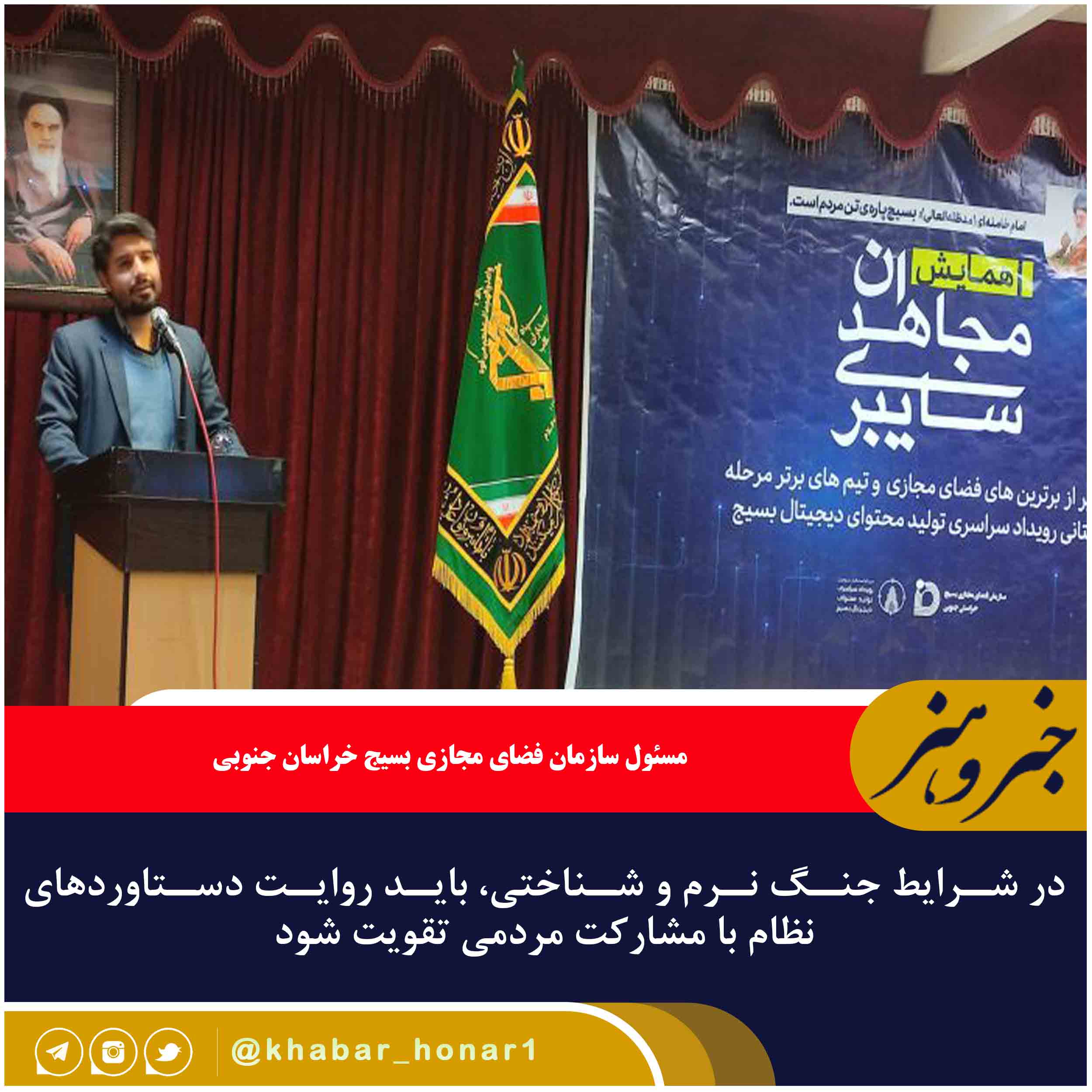 مسئول سازمان فضای مجازی بسیج خراسان جنوبی گفت: در شرایط جنگ نرم و شناختی، باید روایت دستاوردهای نظام با مشارکت مردمی تقویت شود؛ چرا که غفلت از این موضوع، نقطه قوت انقلاب را به نقطه ضعف تبدیل میکند