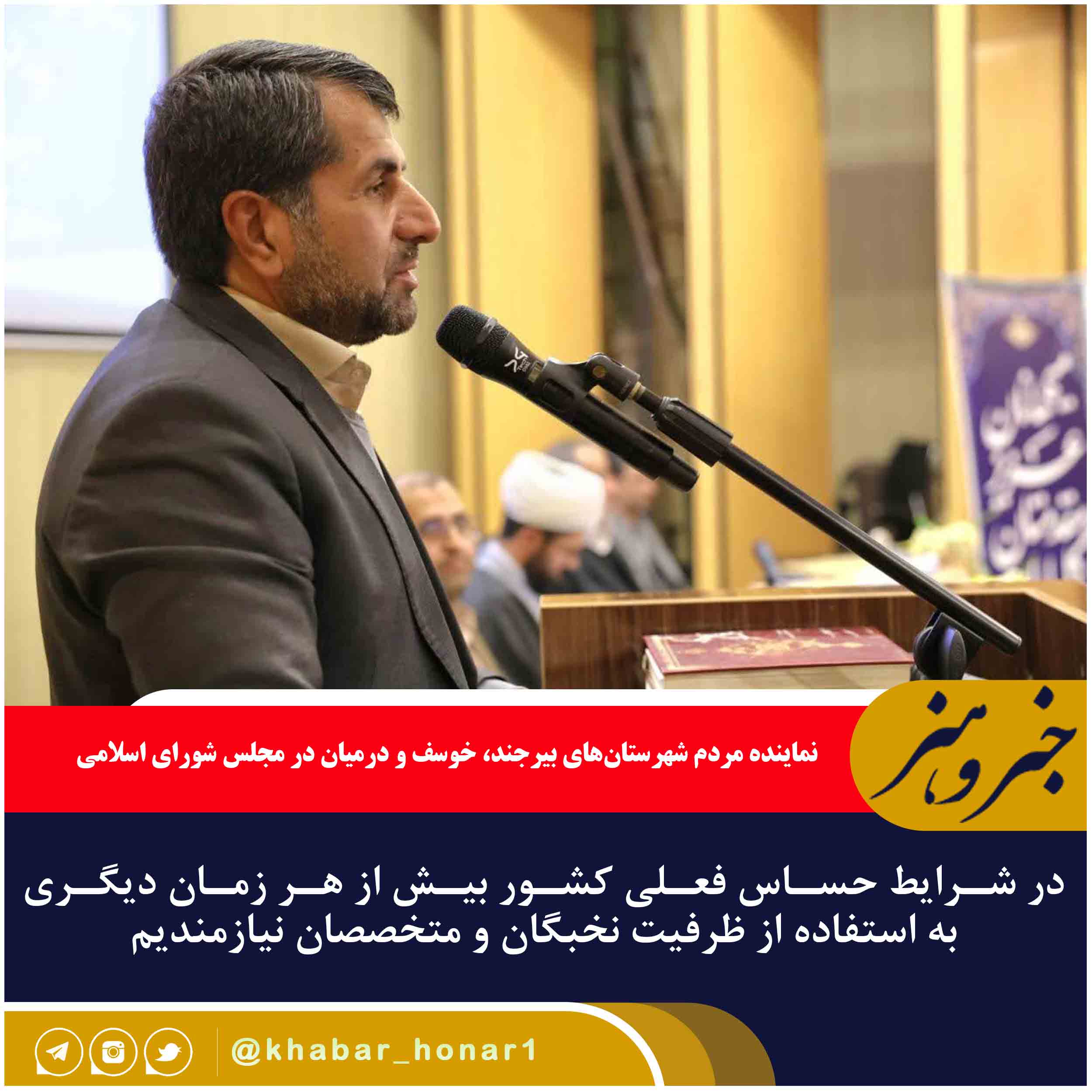 نماینده مردم شهرستانهای بیرجند، خوسف و درمیان در مجلس شورای اسلامی گفت: حفظ نخبگان و جلوگیری از مهاجرت آنان از ضروریات امروز خراسان جنوبی است و باید با تدابیر ویژه زمینه ماندگاری و بهرهمندی از ظرفیتهای علمی و تخصصی این عزیزان فراهم شود.