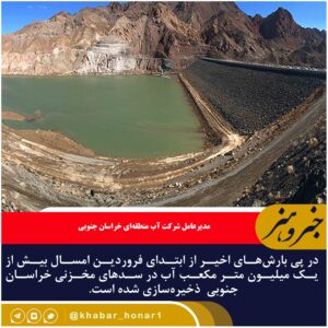 مدیرعامل شرکت آب منطقهای خراسان جنوبی گفت: در پی بارشهای اخیر از ابتدای فروردین امسال بیش از یک میلیون متر مکعب آب در سدهای مخزنی خراسان جنوبی ذخیرهسازی شده است.سعید سروری اعلام کرد: از ابتدای سال آبی تاکنون بیش از ۶ میلیون متر مکعب در هشت سد مخزنی استان آبگیری انجام شده است که از این میزان سهم بارندگی از ابتدای فروردین ۱۴۰۲ بیش از یک میلیون متر مکعب آبگیری شد.
