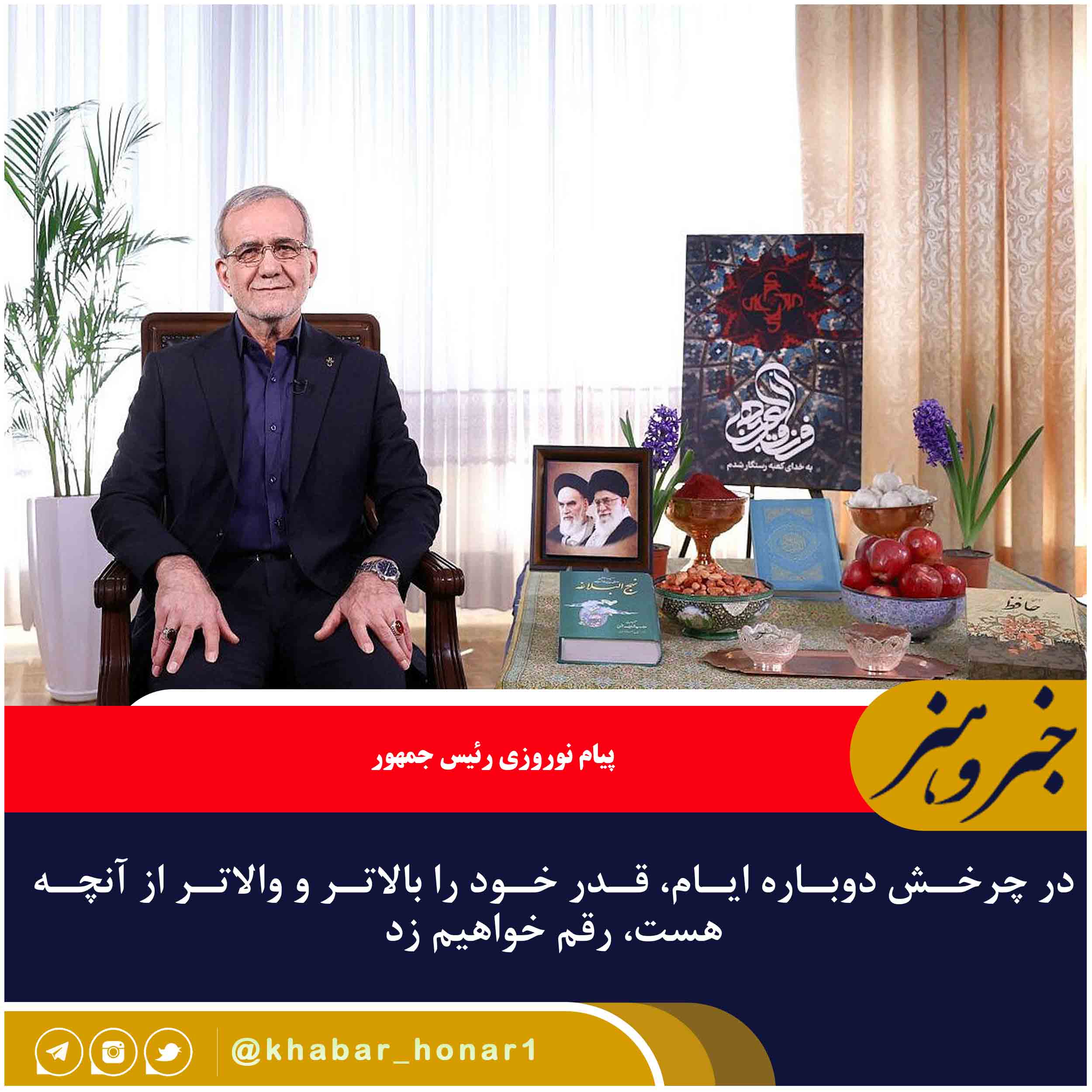دکتر مسعود پزشکیان در پیام نوروزی خود به مناسبت حلول سال نو و نوروز ۱۴۰۴ اظهار داشت: ما در آغاز چرخش دوبارهی ایام، قدر خویش را برتر و بالاتر و باعزتتر از اینکه داشتهایم، رقم خواهیم زد و مصممیم که با همدلی و همبستگی، ایران عزیزمان را با اعتقاد و باور خویش و با اراده و عزم شما مردم عزیز، بهدور از زشتی و پلیدیها و بیعدالتیها ترسیم کنیم و برای رسیدن به آن از هیچ کوششی دریغ نخواهیم کرد.