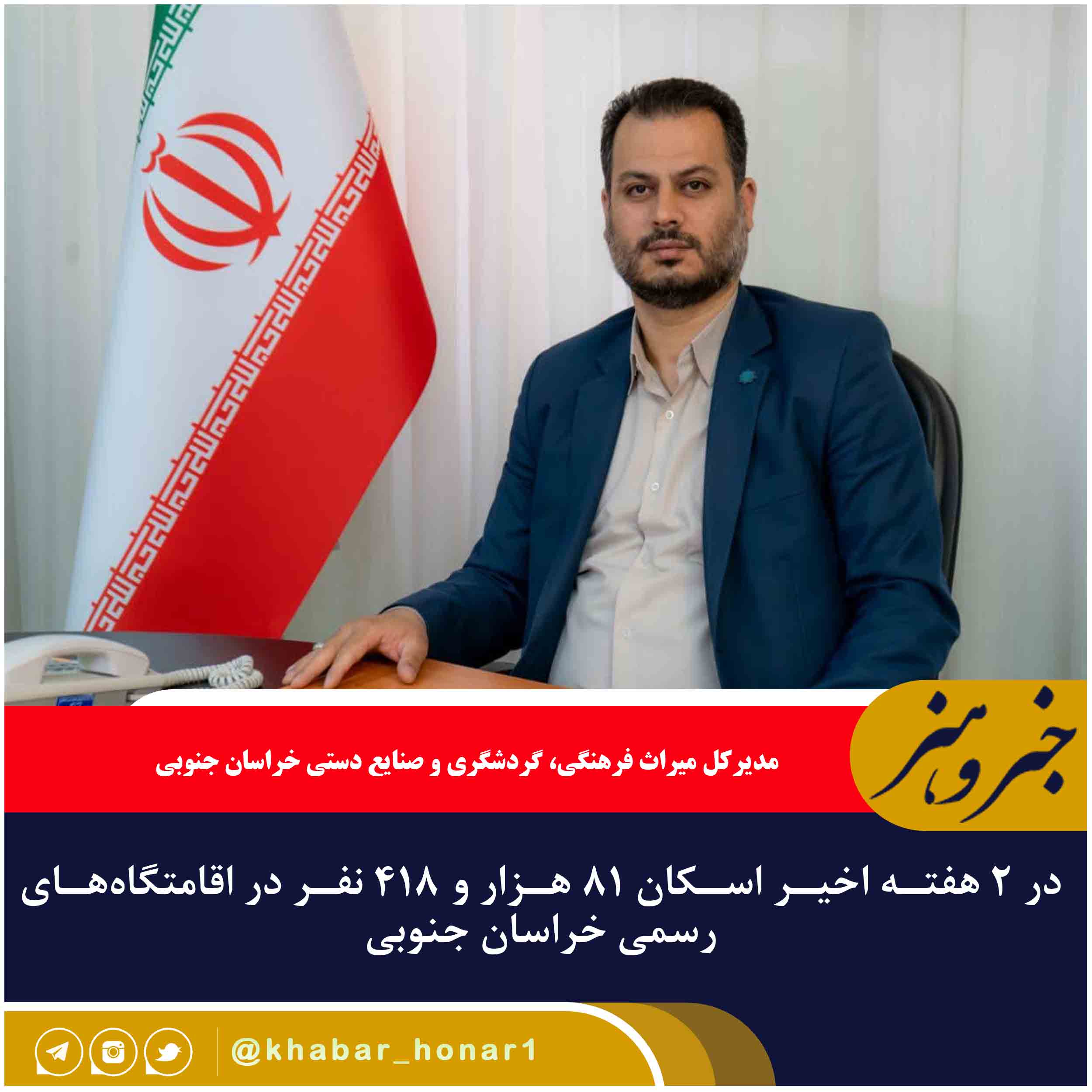 مدیرکل میراث فرهنگی، گردشگری و صنایع دستی خراسان جنوبی گفت: در ۲ هفته اخیر ۸۱ هزار و ۴۱۸ نفر معادل ۲۵.۲۸ درصد از مسافران نوروزی و گردشگران استان در اقامتگاه‌های رسمی تحت پوشش این نهاد اقامت کرده اند.