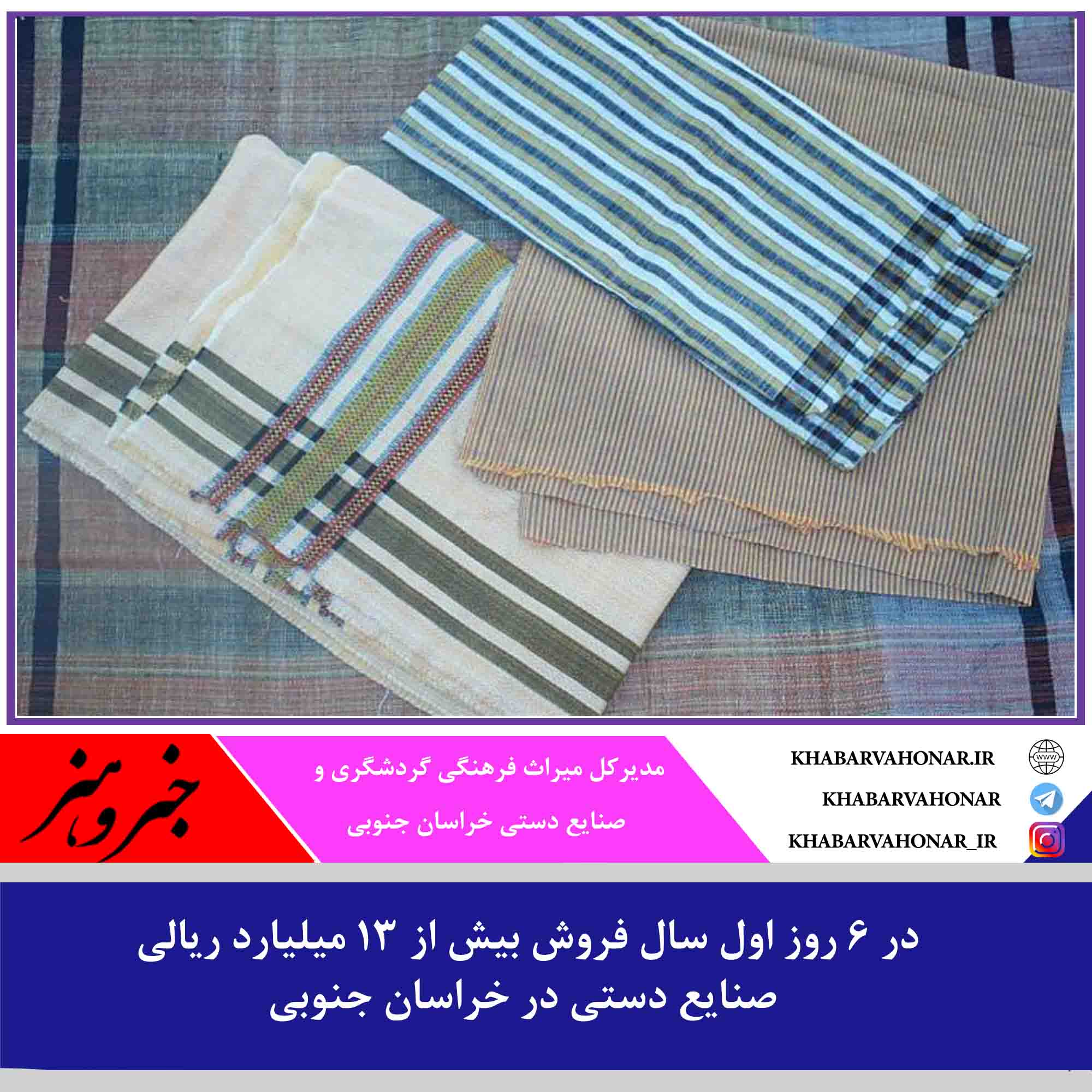 در ایام نوروز در ۶ روز اول سال حدود ۱۳ میلیارد و ۸۵ میلیون ریال صنایع دستی در خراسان جنوبی به فروش رسید.