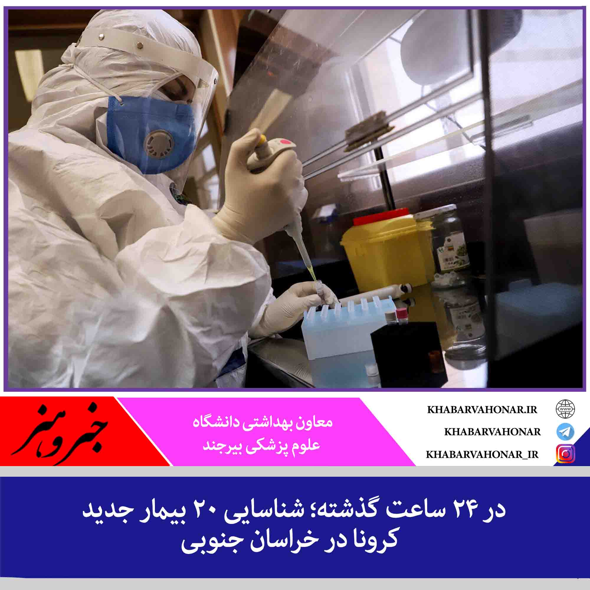 ?معاون بهداشتی دانشگاه علوم پزشکی بیرجند با بیان اینکه در شبانه روز گذشته ۱۳۱ آزمایش کرونا در استان انجام شد که ۲۰ آزمایش، مثبت قطعی اعلام شد، گفت: از ۲۰ مبتلای جدید به کرونا، ۱ نفر در بیمارستانها بستری اند و ۱۹ نفر نیز نمونه گیری سرپایی شدند.