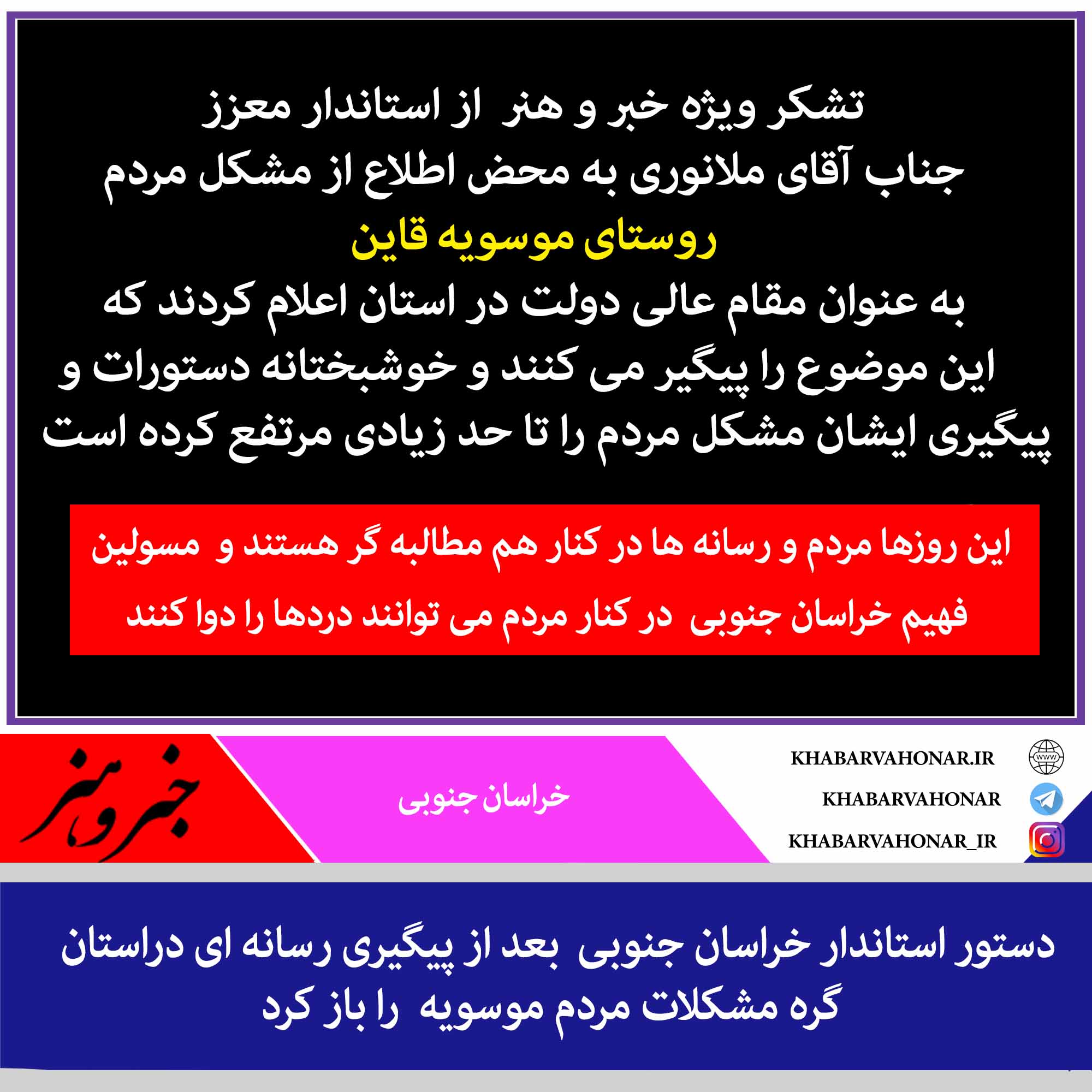 تشکر ویژه خبر و هنر از استاندار معزز جناب آقای ملانوری به محض اطلاع از مشکل مردم روستای موسویه قاین به عنوان مقام عالی دولت در استان اعلام کردند که این موضوع را پیگیر می کنند و خوشبختانه دستورات و پیگیری ایشان مشکل مردم را تا حد زیادی مرتفع کرده است