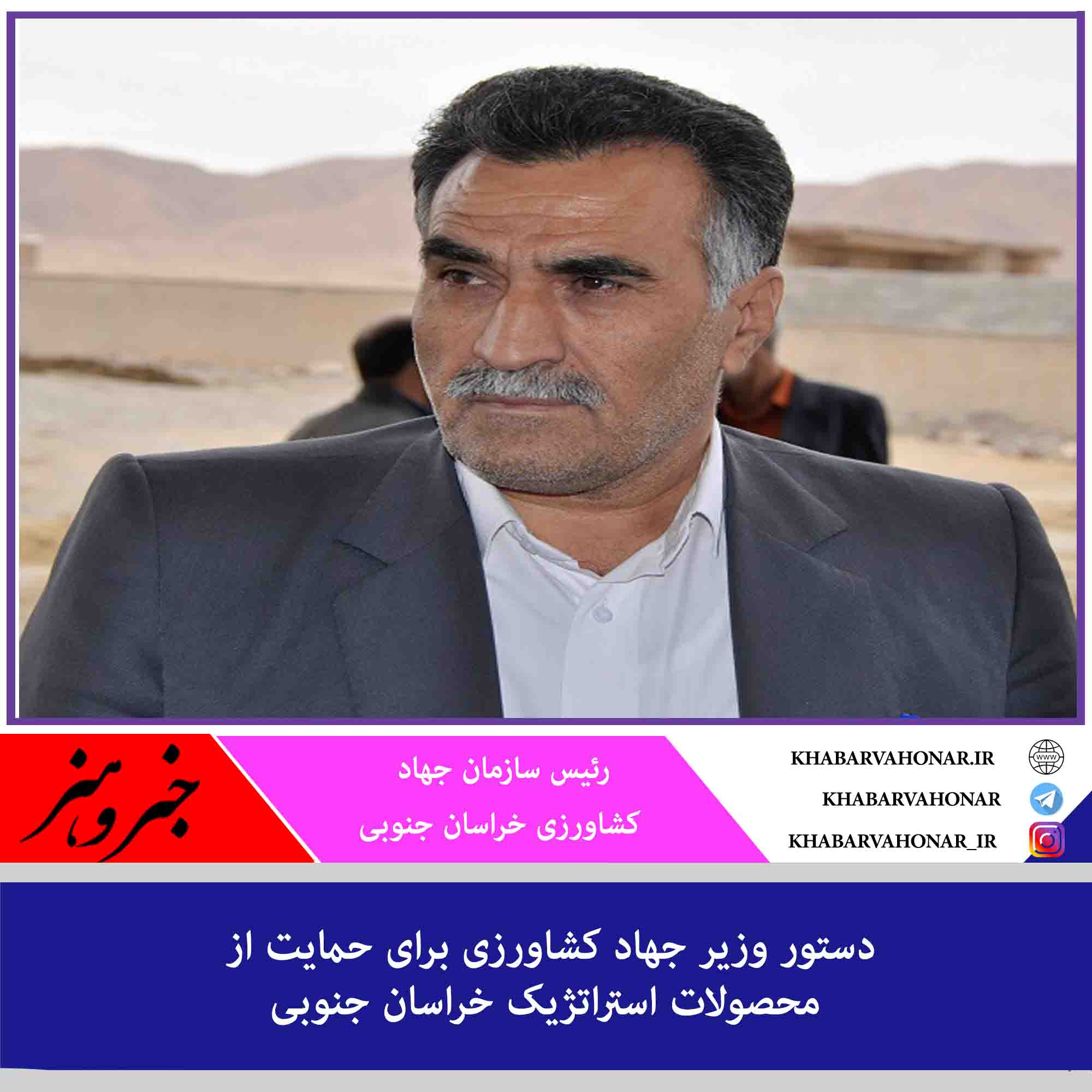 ?رئیس سازمان جهاد کشاورزی خراسان جنوبی: در سفر اخیر وزیر جهاد کشاورزی علاوه بر تخصیص اعتبار بدون محدودیت توسعه سیستم های نوین آبیاری در منطقه، برای معرفی محصولات کشاورزی استان به ویژه زرشک و زعفران در هر سطحی چه کشوری و چه بین المللی قول حمایت مالی داده شد.