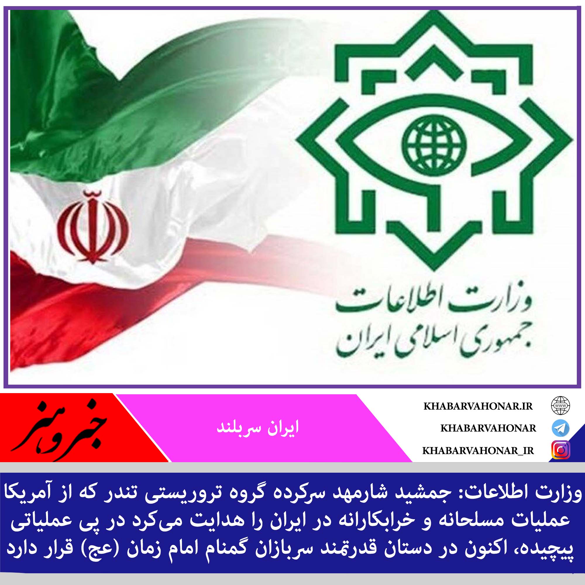 وزارت اطلاعات: جمشید شارمهد سرکرده گروه تروریستی تندر که از آمریکا عملیات مسلحانه و خرابکارانه در ایران را هدایت میکرد در پی عملیاتی پیچیده، اکنون در دستان قدرتمند سربازان گمنام امام زمان (عج) قرار دارد.