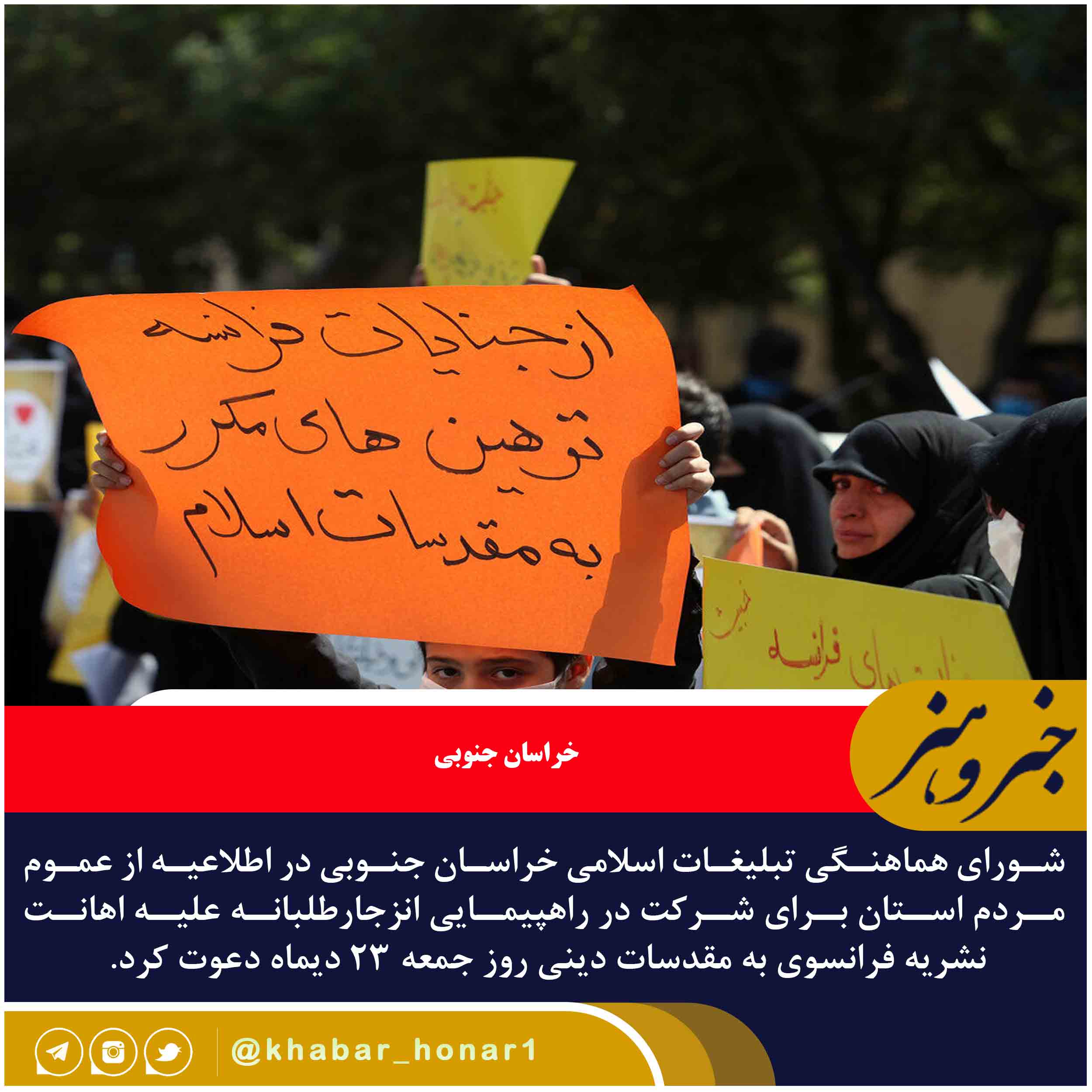 شورای هماهنگی تبلیغات اسلامی خراسان جنوبی در اطلاعیه از عموم مردم استان برای شرکت در راهپیمایی انزجارطلبانه علیه اهانت نشریه فرانسوی به مقدسات دینی روز جمعه ۲۳ دیماه دعوت کرد.