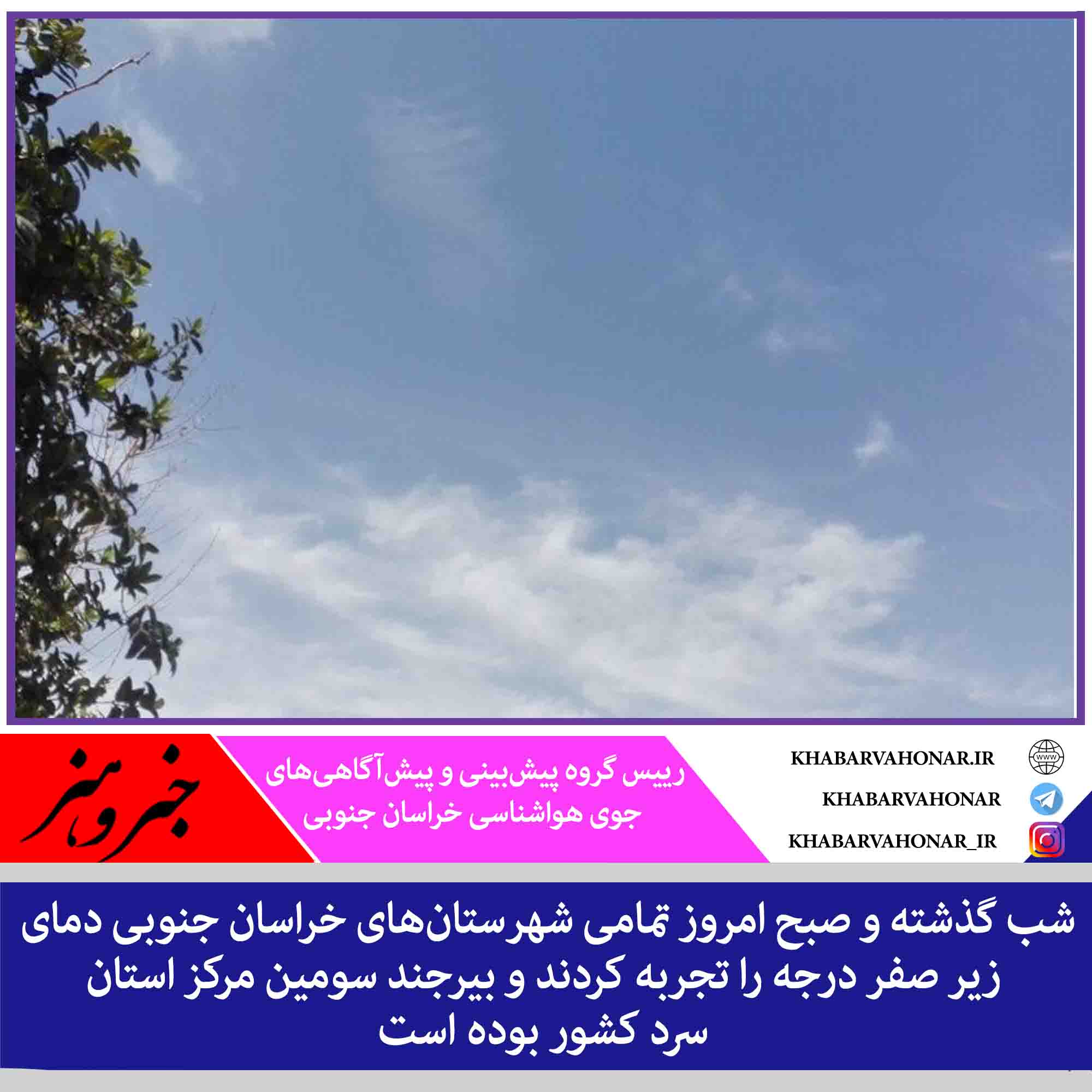 رییس گروه پیشبینی و پیشآگاهیهای جوی اداره کل هواشناسی خراسان جنوبی گفت: شب گذشته و صبح امروز تمامی شهرستانهای خراسان جنوبی دمای زیر صفر درجه را تجربه کردند و بیرجند سومین مرکز استان سرد کشور بوده است.