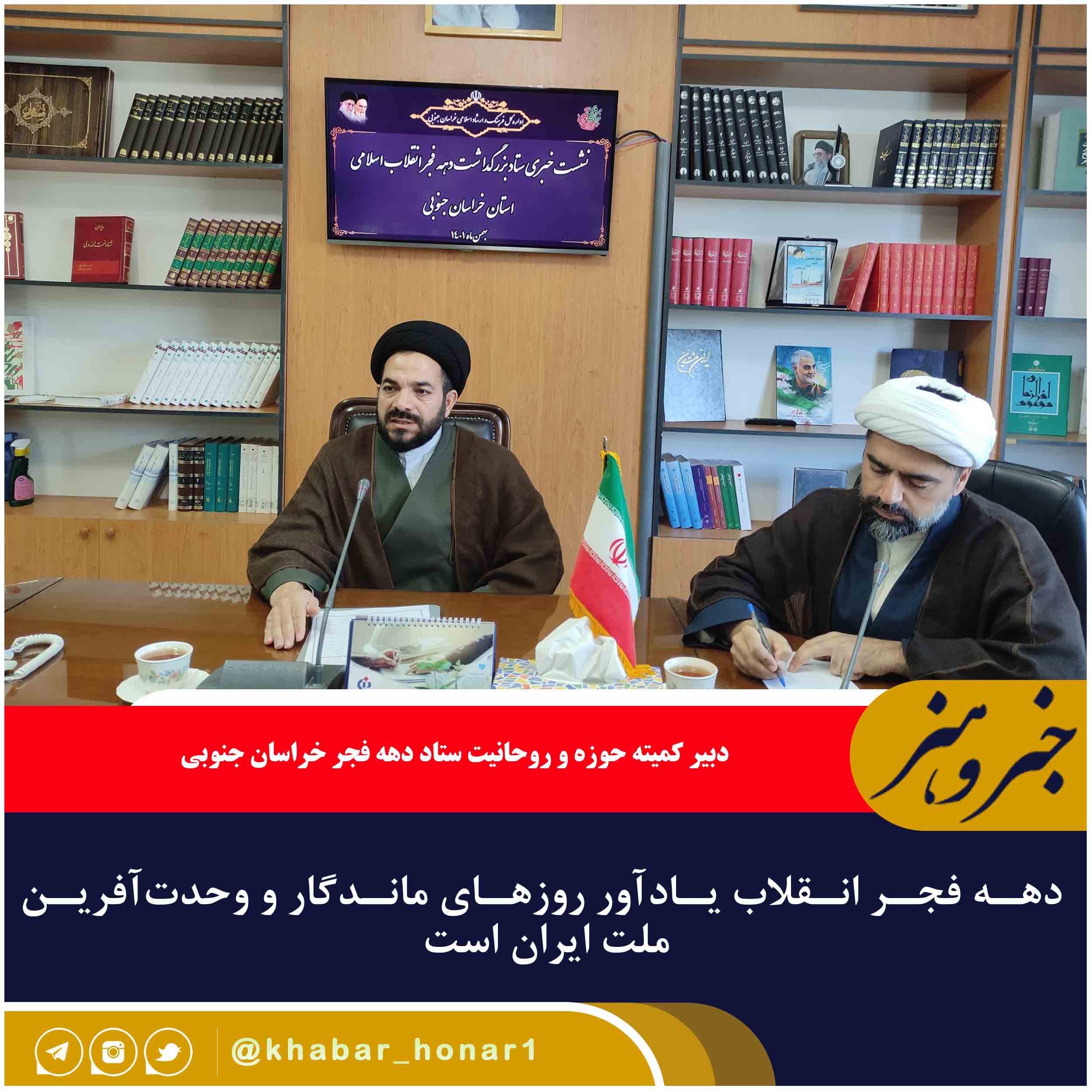 وی از برگزاری همایش نومزدوجین با حضور ۹۰ نفر از طلاب استان خراسان جنوبی در پایان هفته جاری خبر داد و گفت: محفل انس با قرآن، تجلیل از برترینهای قرآنی، برگزاری کارگاه سواد رسانه، اعزام ۴۵۰ نفر از مبلغان به مناطق مختلف، برگزاری نشست بصیرتی با حضور مهمانی از نیجریه، نشست اساتید مدارس اهل سنت با موضوع دهه فجر، دیدار با خانواده شهدا و علمای اهل سنت، همایش پیادهروی خانوادگی، زیارت و عطرافشانی مزار شهدا، مراسم جشن انقلاب، برگزاری نشستهای بصیرتی از جمله برنامههای حوزههای علمیه استان در دهه فجر است.