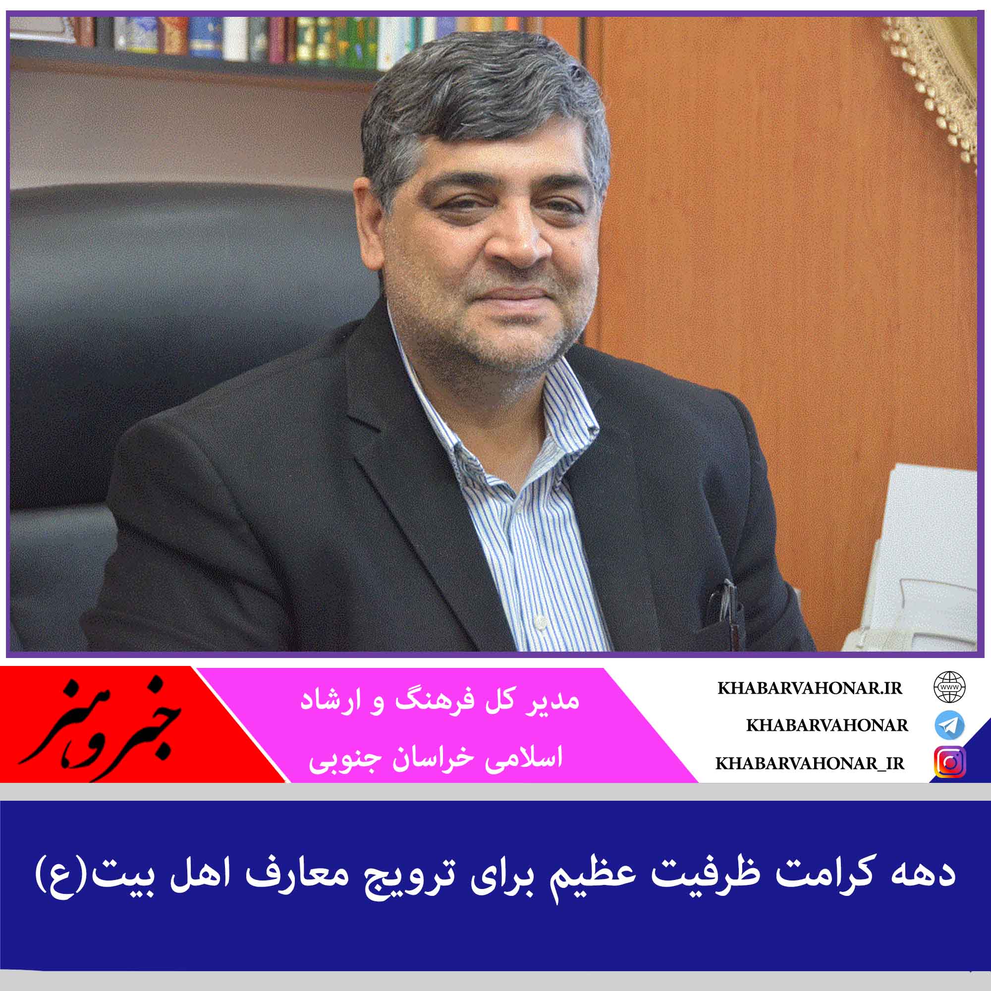 مدیر کل فرهنگ و ارشاد اسلامی خراسان جنوبی گفت: دهه کرامت ظرفیت عظیمی برای ترویج معارف اهل بیت (ع) است.، جلسه برنامه ریزی و بزرگداشت شورای دهه کرامت استان خراسان جنوبی با حضور تمامی دستگاههای عضو این کمیته و همچنین حضور ارزشمند قائم مقام نماینده ولی فقیه در خراسان جنوبی برگزار شد. ناصر نبی زاده در این جلسه، فراهم نمودن نشاط معنوی برای اقشار مختلف جامعه در شرایط کنونی را بسیار مهم و اثر گذار دانست و افزود: دهه کرامت ظرفیت عظیمی برای ترویج معارف اهل بیت(ع) خصوصاً آقا امام رضا(ع) و کریمه اهل بیت حضرت فاطمه معصومه (س) می باشد.