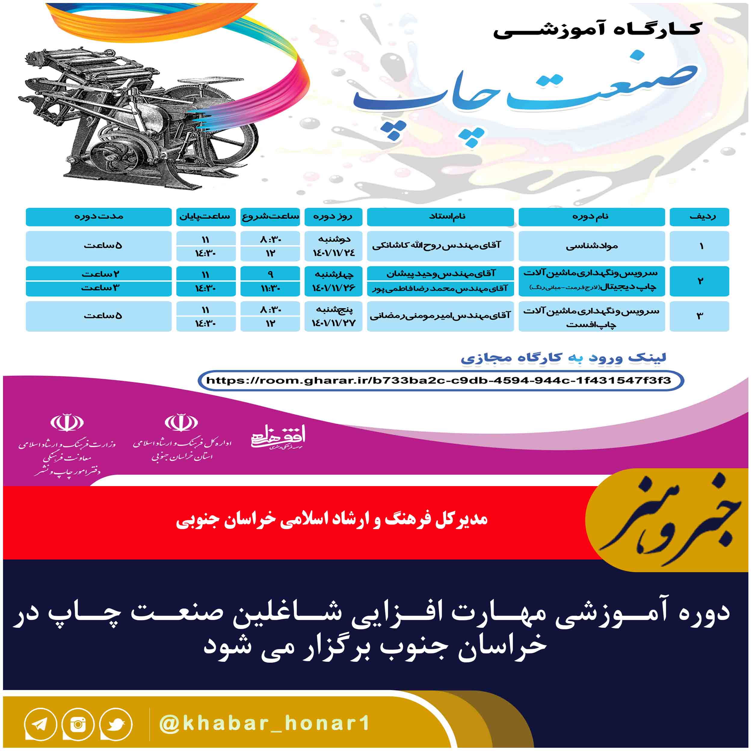 مدیرکل فرهنگ و ارشاد اسلامی خراسان جنوبی از برگزاری دوره آموزشی مهارت افزایی شاغلین در رسته های مختلف چاپ در بهمن ماه جاری خبر داد.ی؛ علی فرخنده با اعلام این خبر گفت: در راستای ارتقای دانش صنعت چاپ و افزایش سطح مهارت شاغلین در رشته های مختلف چاپ دوره های آموزشی «مواد شناسی»، «سرویس و نگهداری ماشین آلات چاپ دیجیتال» و «سرویس و نگهداری ماشین آلات چاپ افست» در بهمن ماه جاری در استان برگزار می گردد.