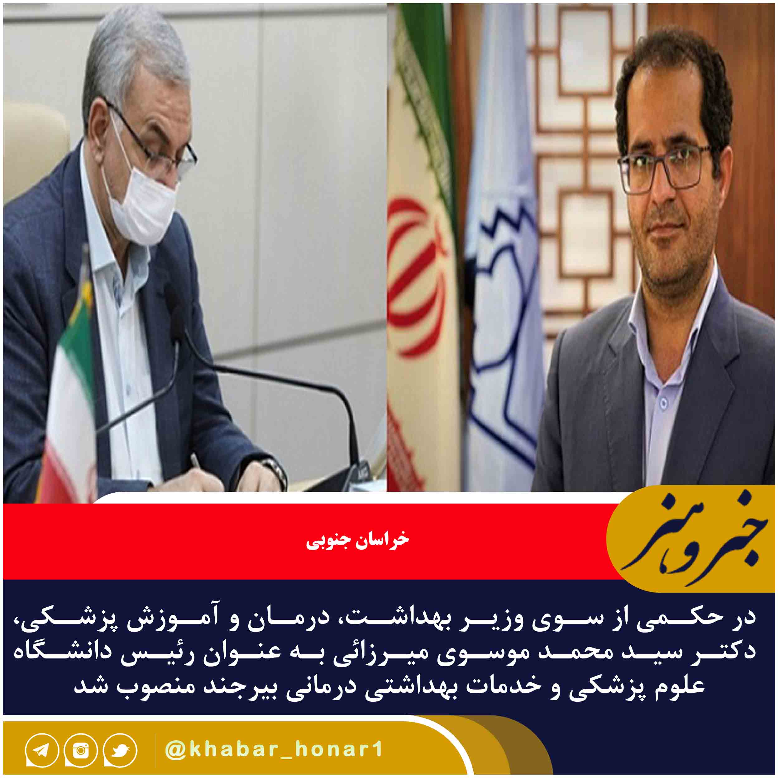 در حکمی از سوی وزیر بهداشت، درمان و آموزش پزشکی، دکتر سید محمد موسوی میرزائی به عنوان رئیس دانشگاه علوم پزشکی و خدمات بهداشتی درمانی بیرجند منصوب شد.به گزارش روابط عمومی دانشگاه، دکتر بهرام عین اللهی طی حکمی با توجه به تایید شورای عالی انقلاب فرهنگی، دکتر سید محمد موسوی میرزائی، سرپرست دانشگاه علوم پزشکی و خدمات بهداشتی درمانی بیرجند را به سمت رییس دانشگاه منصوب کرد.