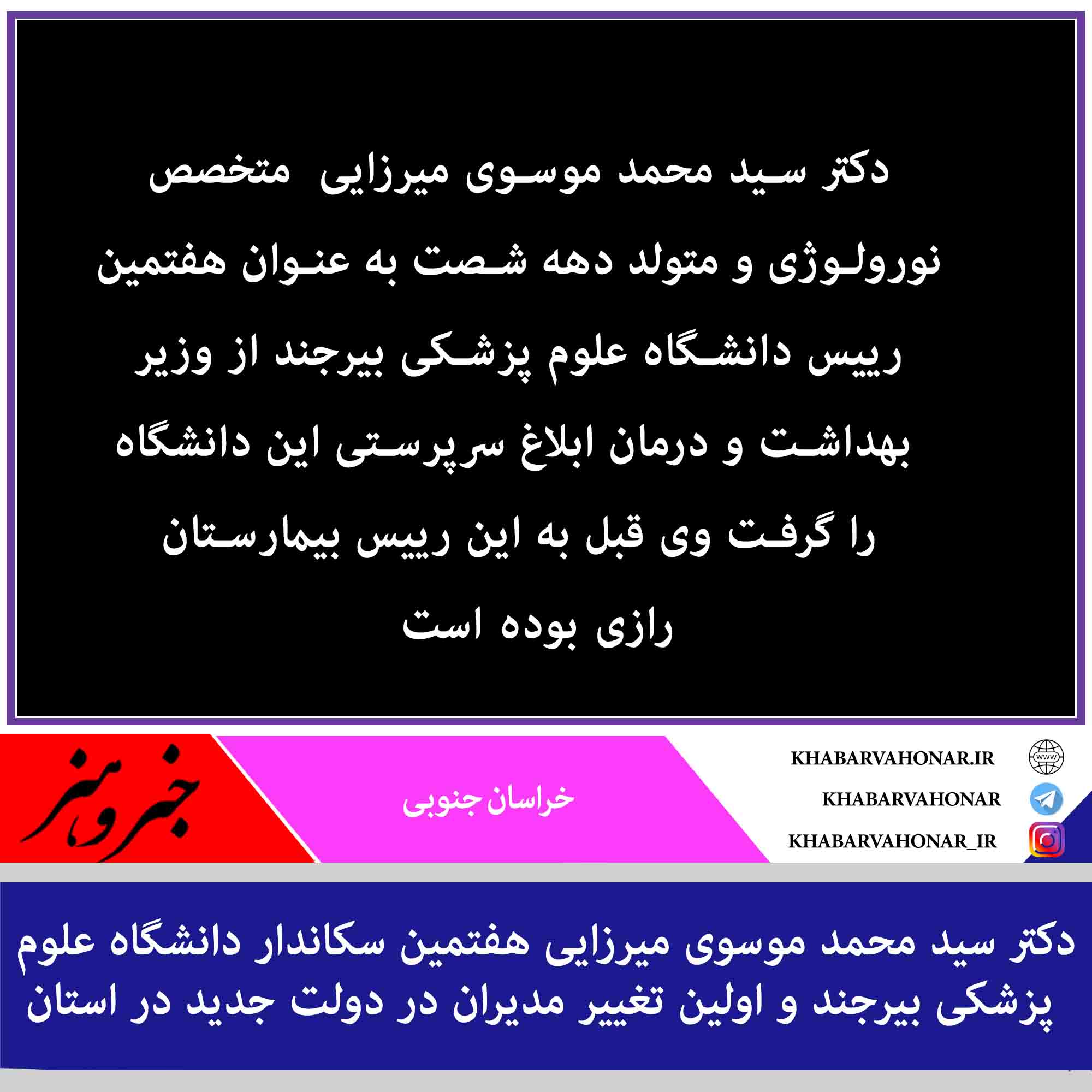 دکتر سید محمد موسوی میرزایی متخصص نورولوژی و متولد دهه شصت به عنوان هفتمین رییس دانشگاه علوم پزشکی بیرجند از وزیر بهداشت و درمان ابلاغ سرپرستی این دانشگاه را گرفت وی قبل به این رییس بیمارستان رازی بوده است