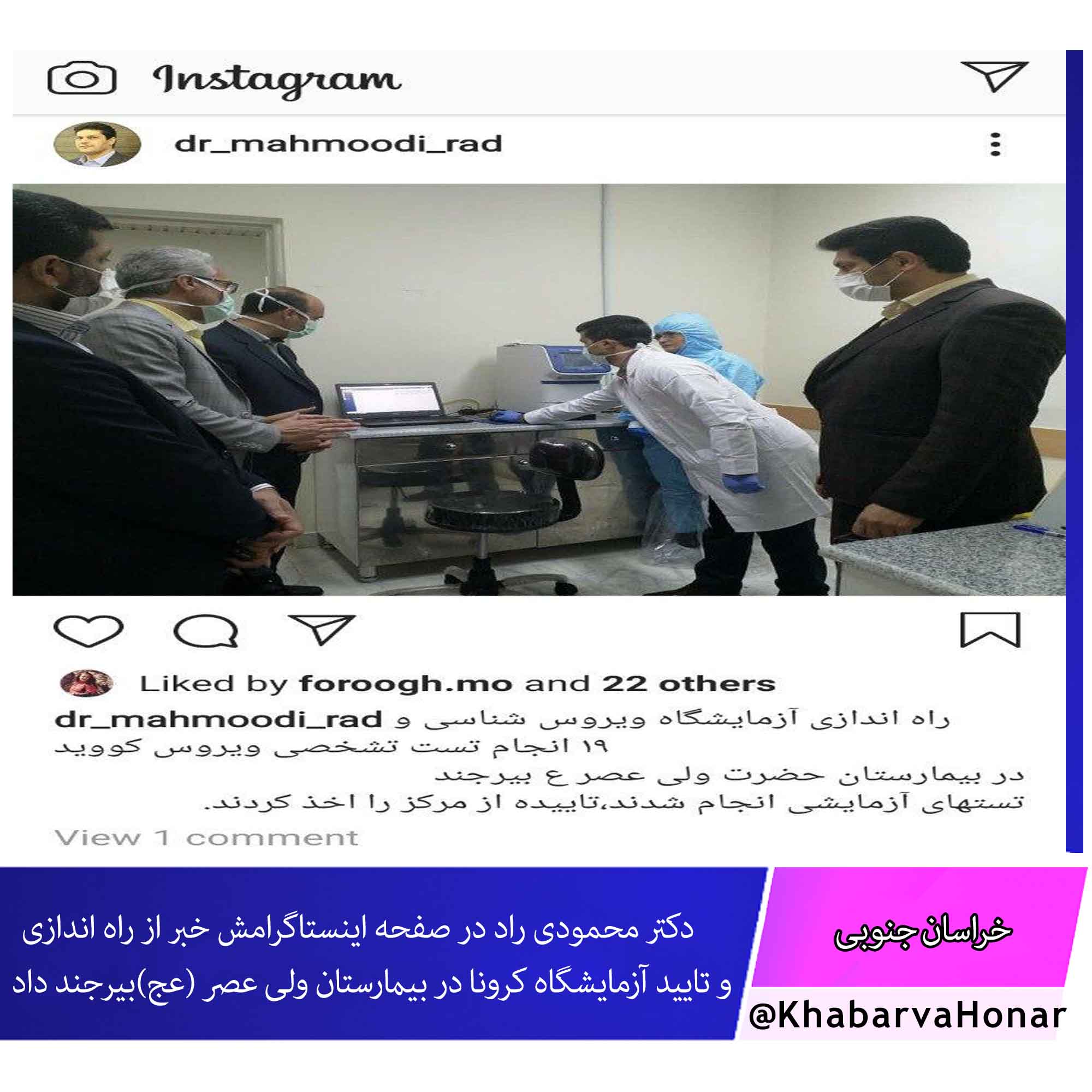 دکتر محمودی راد در صفحه اینستاگرامش خبر از راه اندازی و تایید آزمایشگاه کرونا در بیمارستان ولی عصر (عج)بیرجند داد