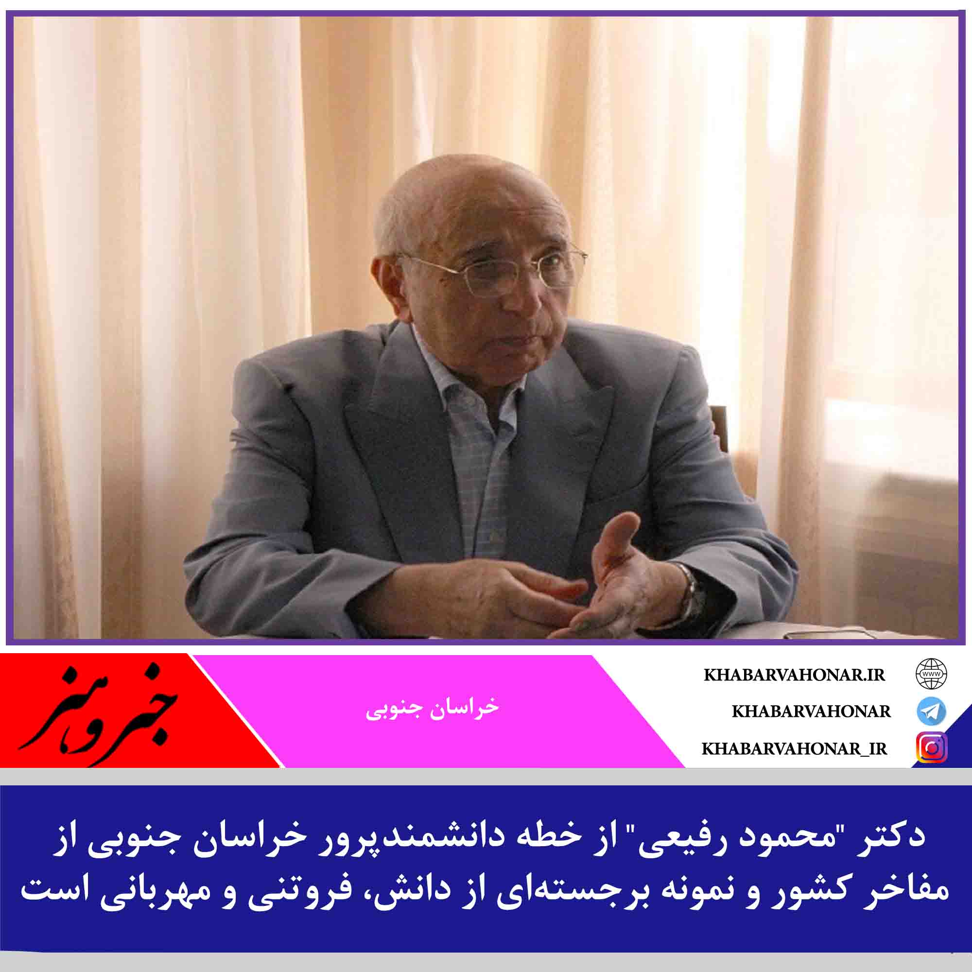 به گزارش ایرنا یکی از این بزرگان، دکتر “محمود رفیعی” از خطه دانشمندپرور خراسان جنوبی از مفاخر کشور و نمونه برجستهای از دانش، فروتنی و مهربانی است که بیش از چند دهه اهتمام به احیا و گسترش فرهنگ ملی ایران و زادگاه خود بیانگر روحیه مجاهدت و تلاش خستگیناپذیر او در حوزه علم و فرهنگ است.