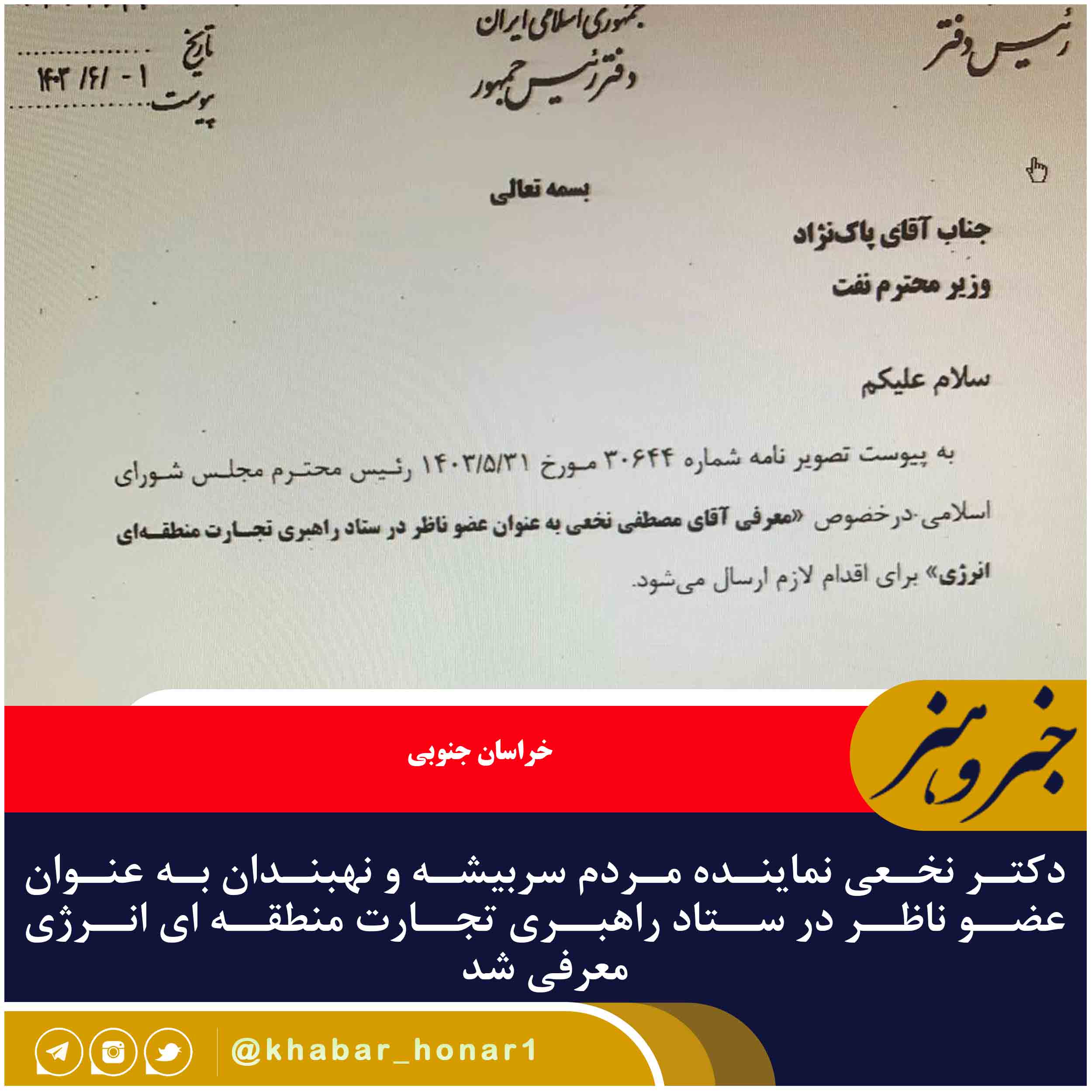 دکتر نخعی نماینده مردم سربیشه و نهبندان به عنوان عضو ناظر در ستاد راهبری تجارت منطقه ای انرژی معرفی شد