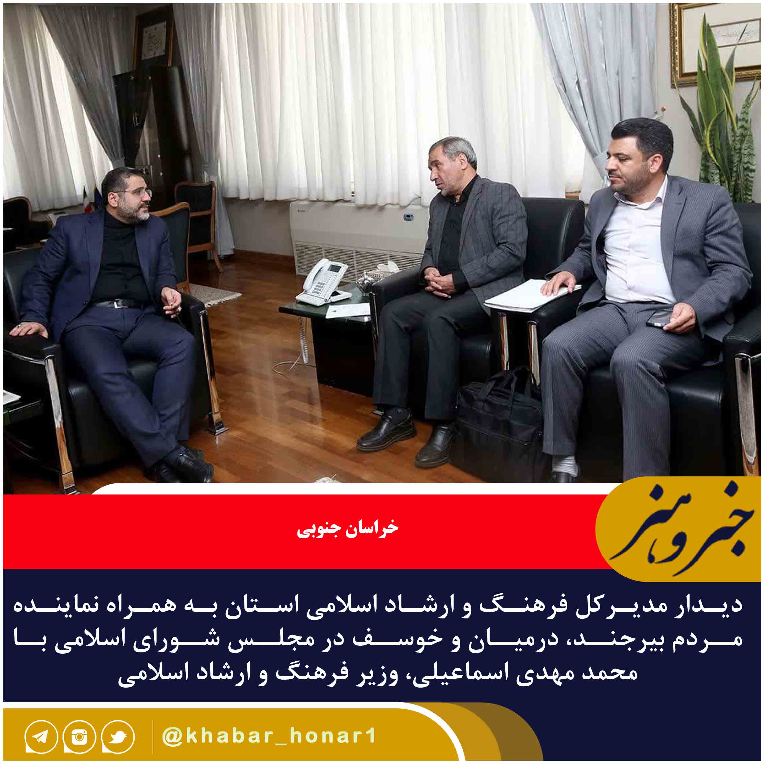 دیدار مدیرکل فرهنگ و ارشاد اسلامی استان به همراه نماینده مردم بیرجند، درمیان و خوسف در مجلس شورای اسلامی با محمد مهدی اسماعیلی، وزیر فرهنگ و ارشاد اسلامی تیرماه ۱۴۰۲