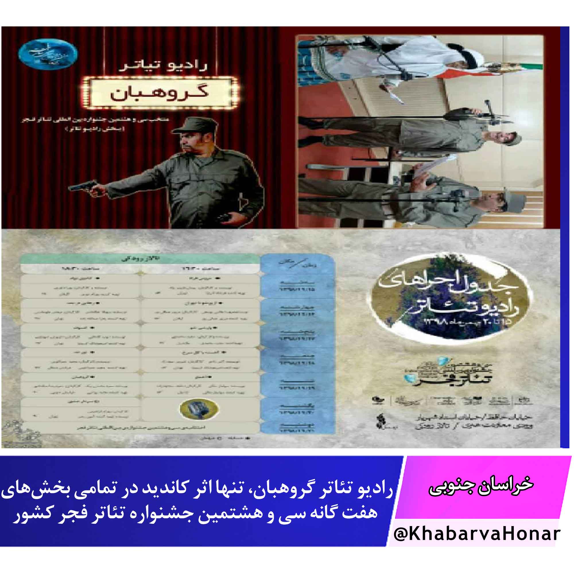 ر حضور داوران و مردم اجرا شد که با اعلام هیات داوران توانست در تمامی بخشها اعم از کارگردانی، نویسندگی، تهیه کنندگی، افکت زنده، بهترین بازیگر نقش مرد و زن و بهترین رادئو تئاتر کاندیدای دریافت جایزه شود.رادیو تئاتر گروهبان از تولیدات صدا و سیمای خراسان جنوبی است که در این جشنواره حضور دارد.
