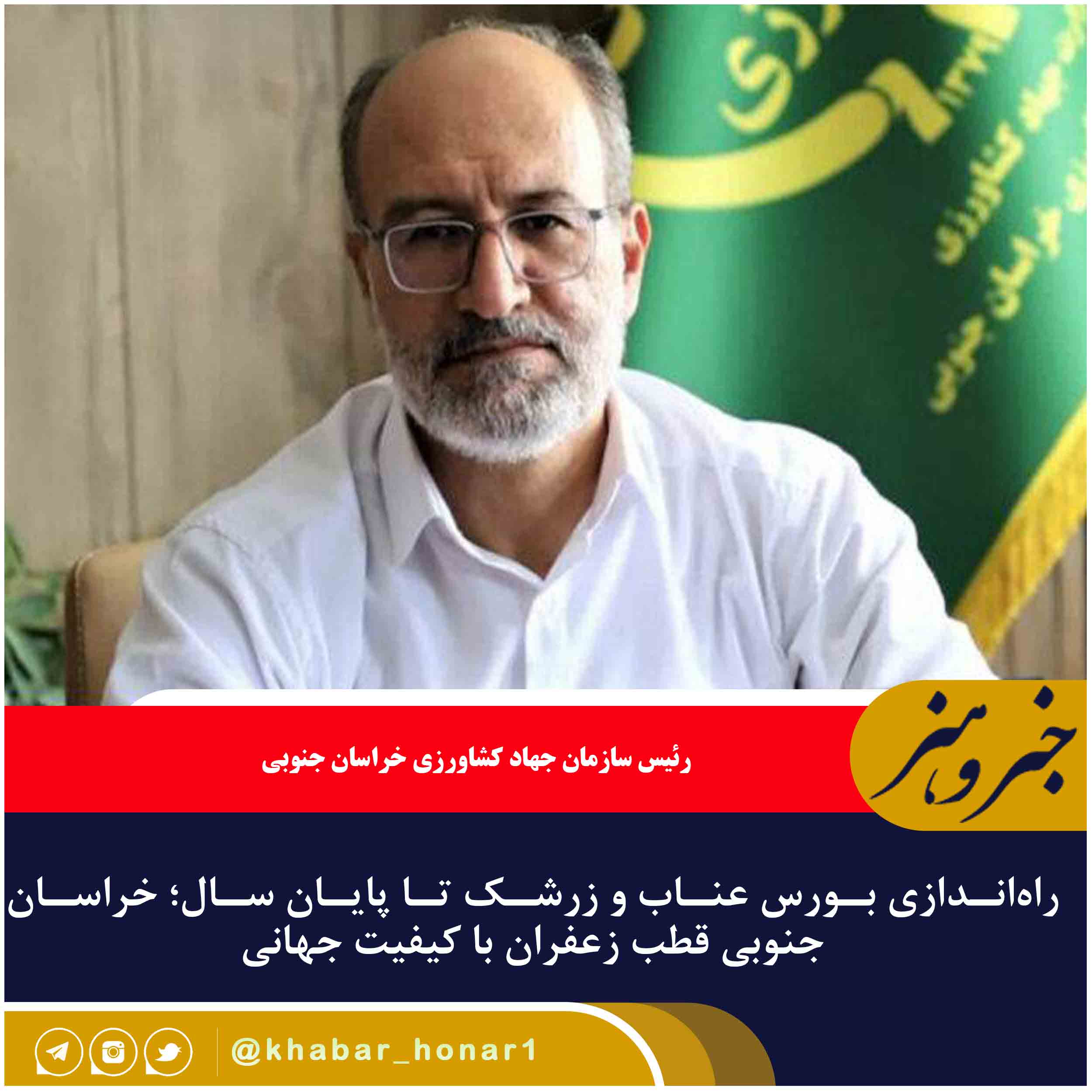 رئیس سازمان جهاد کشاورزی خراسان جنوبی گفت: خراسان جنوبی با کسب رتبه دوم تولید و رتبه اول کیفیت زعفران در ایران و جهان، در مسیر توسعه اقتصادی با راه‌اندازی بورس عناب و زرشک تا پایان سال است تا قیمت این محصولات مزیت‌دار به صورت رسمی و شفاف تعیین شود.