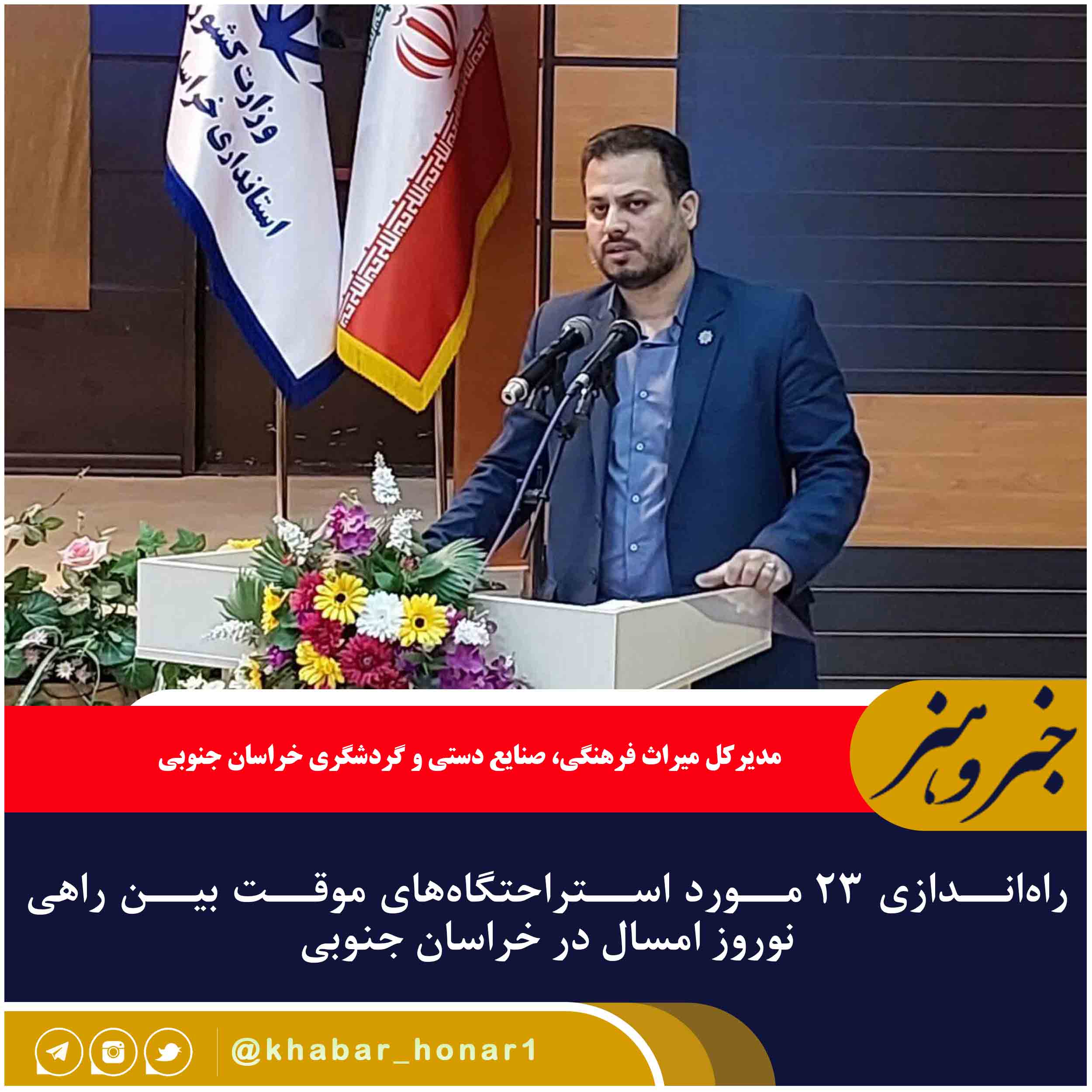 مدیرکل میراث فرهنگی، صنایع دستی و گردشگری خراسان جنوبی از راهاندازی ۲۳ مورد استراحتگاههای موقت بین راهی در نوروز امسال در استان خبرداد و گفت: باید در راستای کاهش تصادفات استان اقدامات قابل توجهی انجام شود چرا که در صورت افزایش تصادفات سایر خدمات ستاد اجرایی زیر سوال خواهد رفت.
