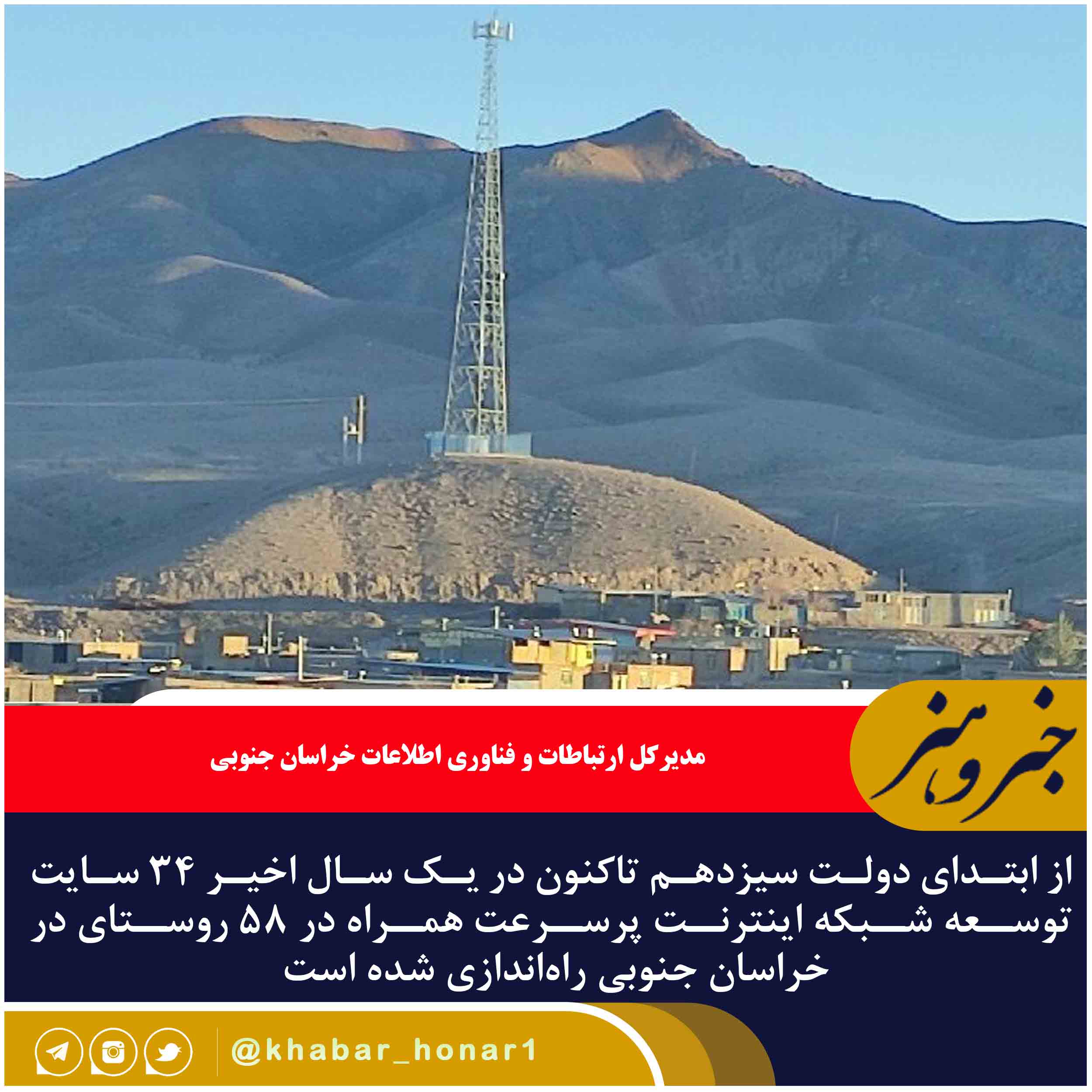 مدیرکل ارتباطات و فناوری اطلاعات خراسان جنوبی گفت: از ابتدای دولت سیزدهم تاکنون در یک سال اخیر ۳۴ سایت توسعه شبکه اینترنت پرسرعت همراه در ۵۸ روستای در خراسان جنوبی راهاندازی شده است.