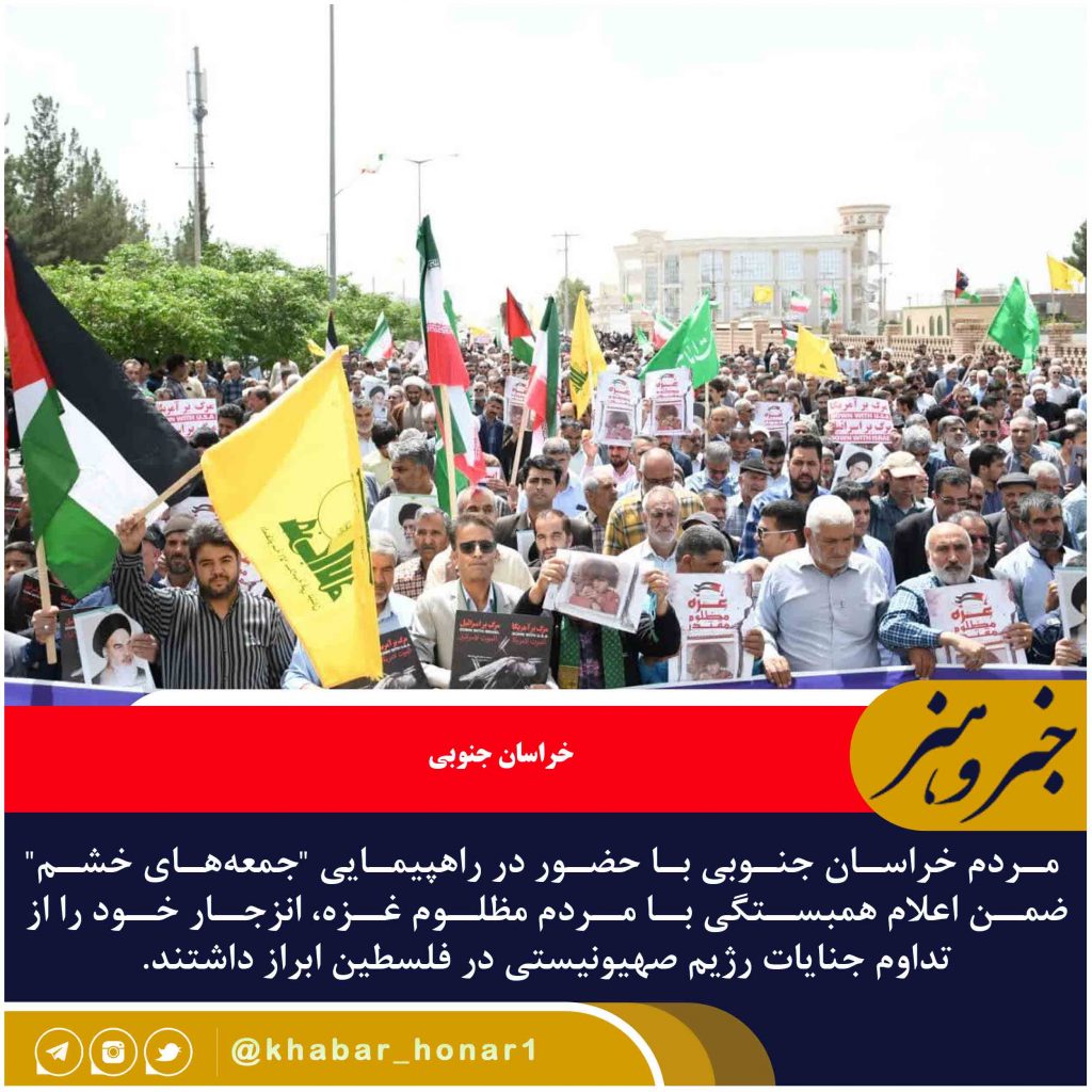 مردم خراسان جنوبی با حضور در راهپیمایی “جمعههای خشم” ضمن اعلام همبستگی با مردم مظلوم غزه، انزجار خود را از تداوم جنایات رژیم صهیونیستی در فلسطین ابراز داشتند.