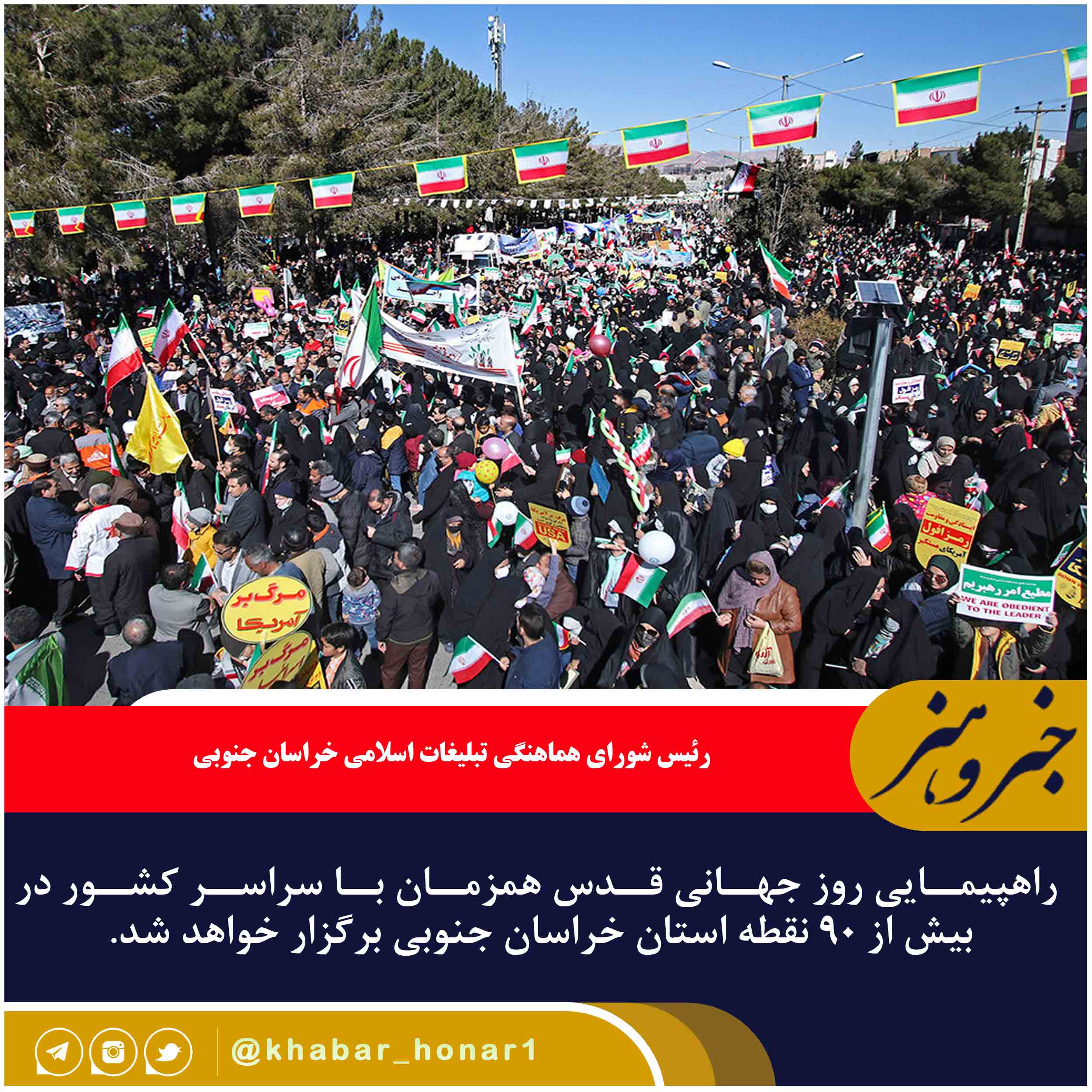 رئیس شورای هماهنگی تبلیغات اسلامی خراسان جنوبی گفت: راهپیمایی روز جهانی قدس همزمان با سراسر کشور در بیش از ۹۰ نقطه استان خراسان جنوبی برگزار خواهد شد.