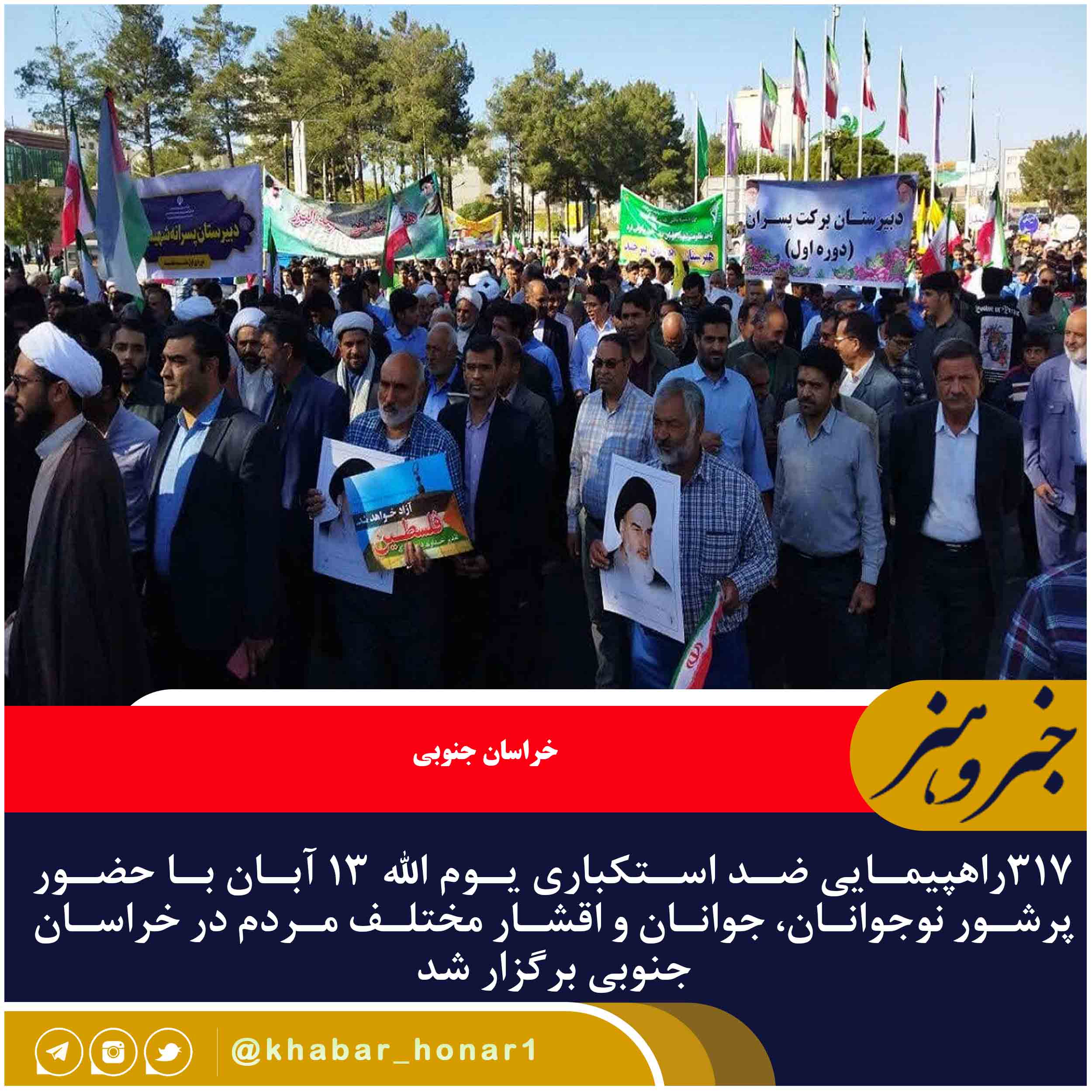 – راهپیمایی ضد استکباری یوم الله ۱۳ آبان با حضور پرشور نوجوانان، جوانان و اقشار مختلف مردم بیرجند از میدان ابوذر به سمت میدان قدس این شهر آغاز شد و فریاد مرگ بر امریکا در این دیار انداز شد.