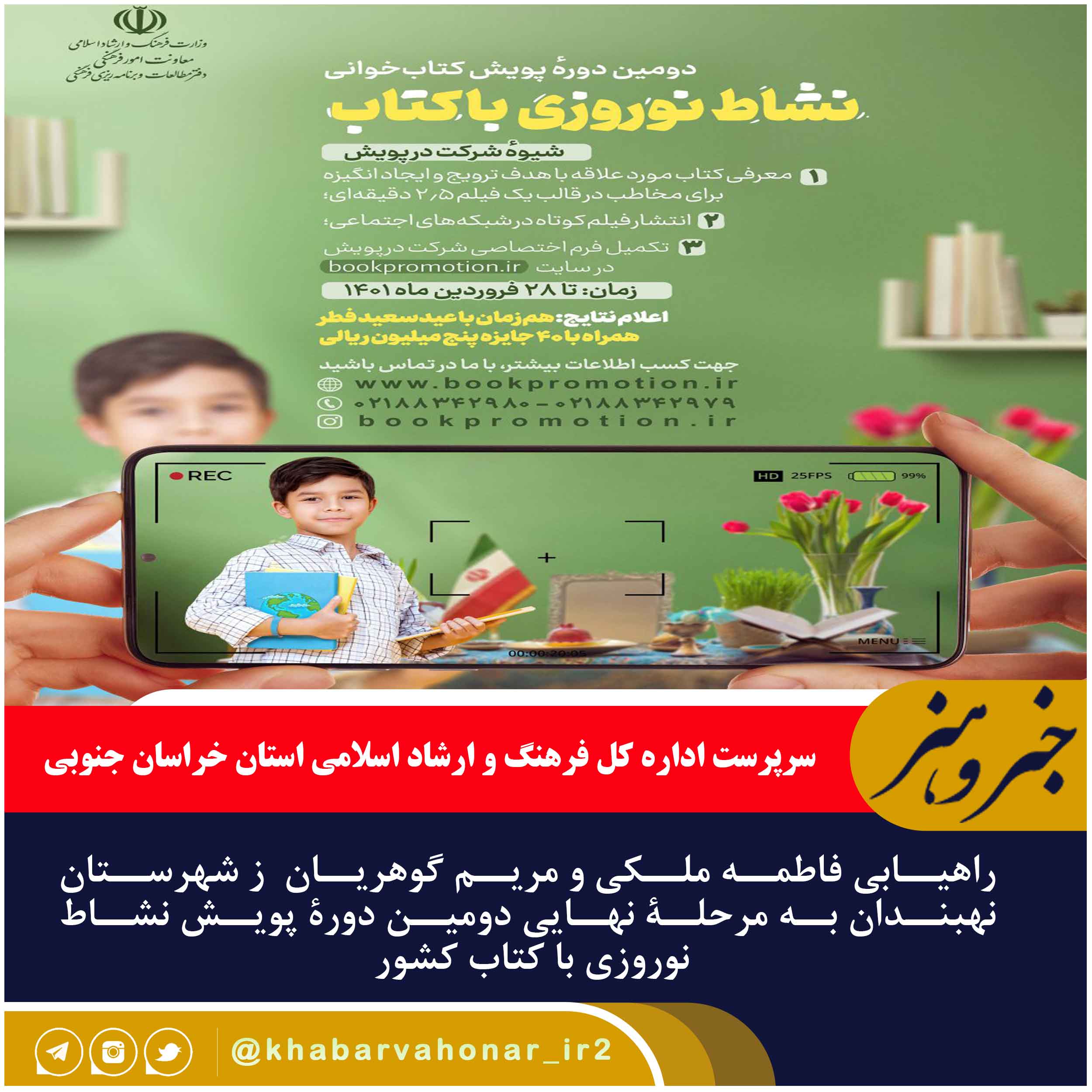 سرپرست اداره کل فرهنگ و ارشاد اسلامی استان خراسان جنوبی از راهیابی فاطمه ملکی و مریم گوهریان ز شهرستان نهبندان به مرحلۀ نهایی دومین دورۀ پویش نشاط نوروزی با کتاب کشور خبر داد.