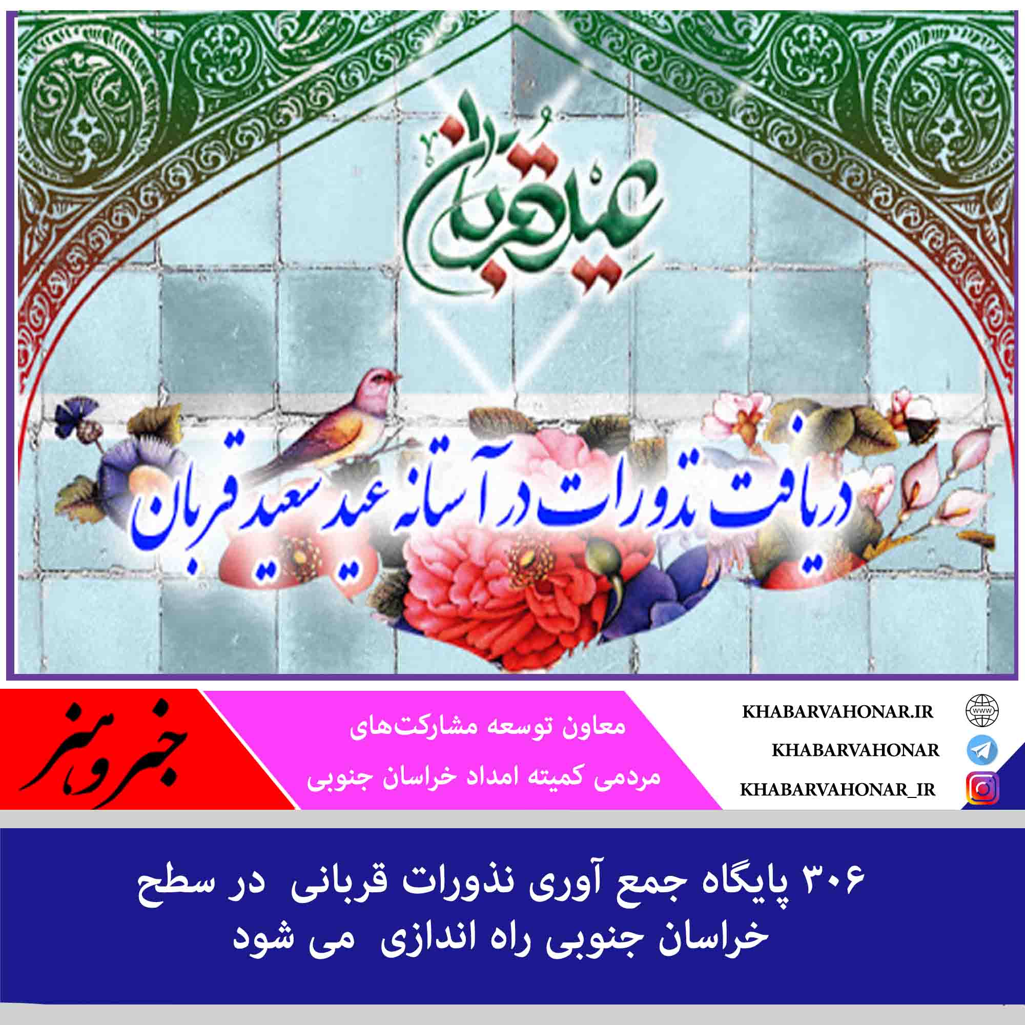 همزمان با عید سعید قربان ۳۰۶ پایگاه جمع آوری نذورات قربانی مردم خیر و نوع دوست ، در سطح استان برپا میشود.