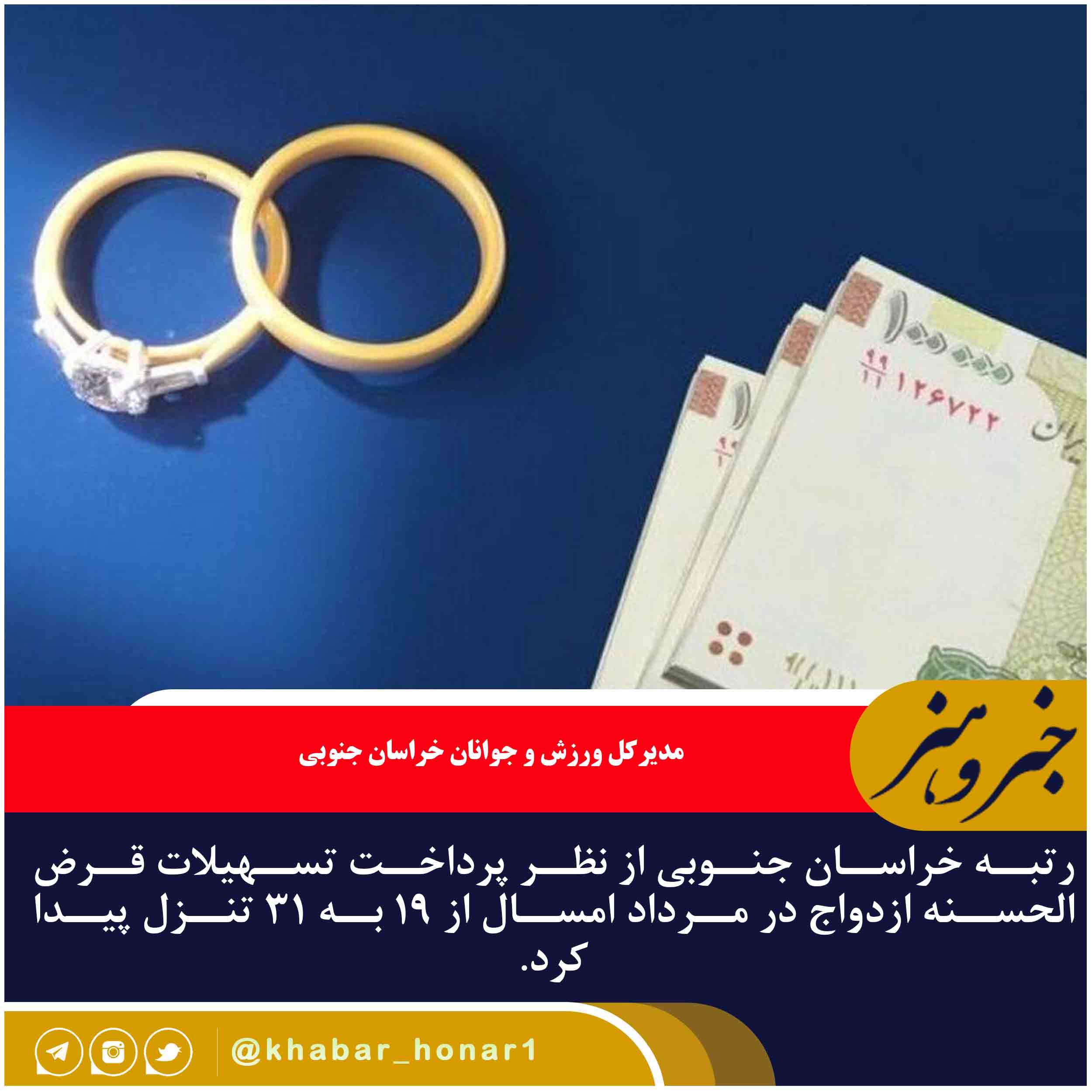 مدیرکل ورزش و جوانان خراسان جنوبی گفت: رتبه خراسان جنوبی از نظر پرداخت تسهیلات قرض‌الحسنه ازدواج در مرداد امسال از ۱۹ به ۳۱ تنزل پیدا کرد.