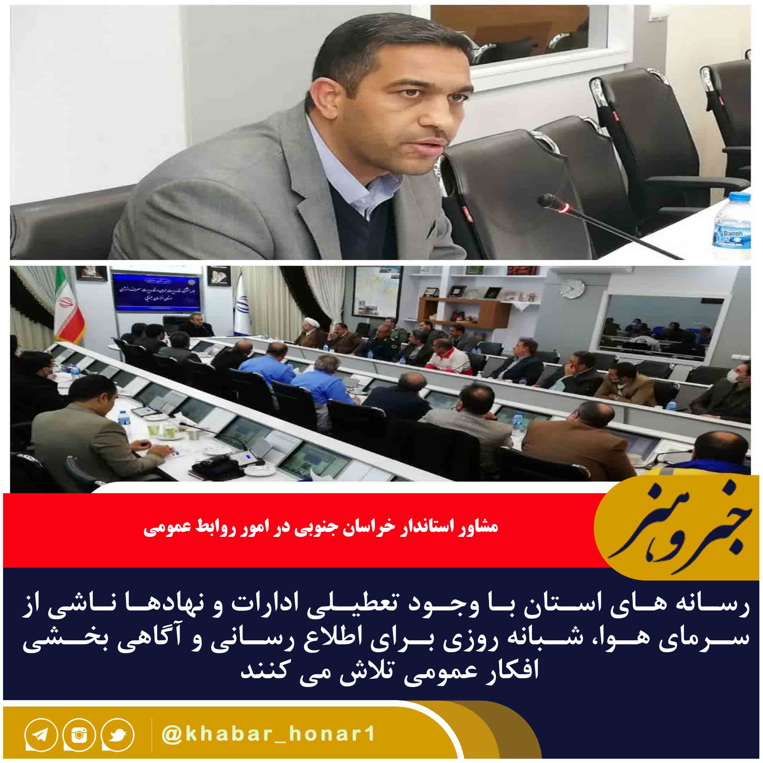 مشاور استاندار خراسان جنوبی در امور روابط عمومی با اشاره به فعالیت و تلاش جهادی رسانه های استان در روزهای تعطیل و سرد زمستان، گفت: رسانه های استان با وجود تعطیلی ادارات و نهادها ناشی از سرمای هوا، شبانه روزی برای اطلاع رسانی و آگاهی بخشی افکار عمومی تلاش می کنند.