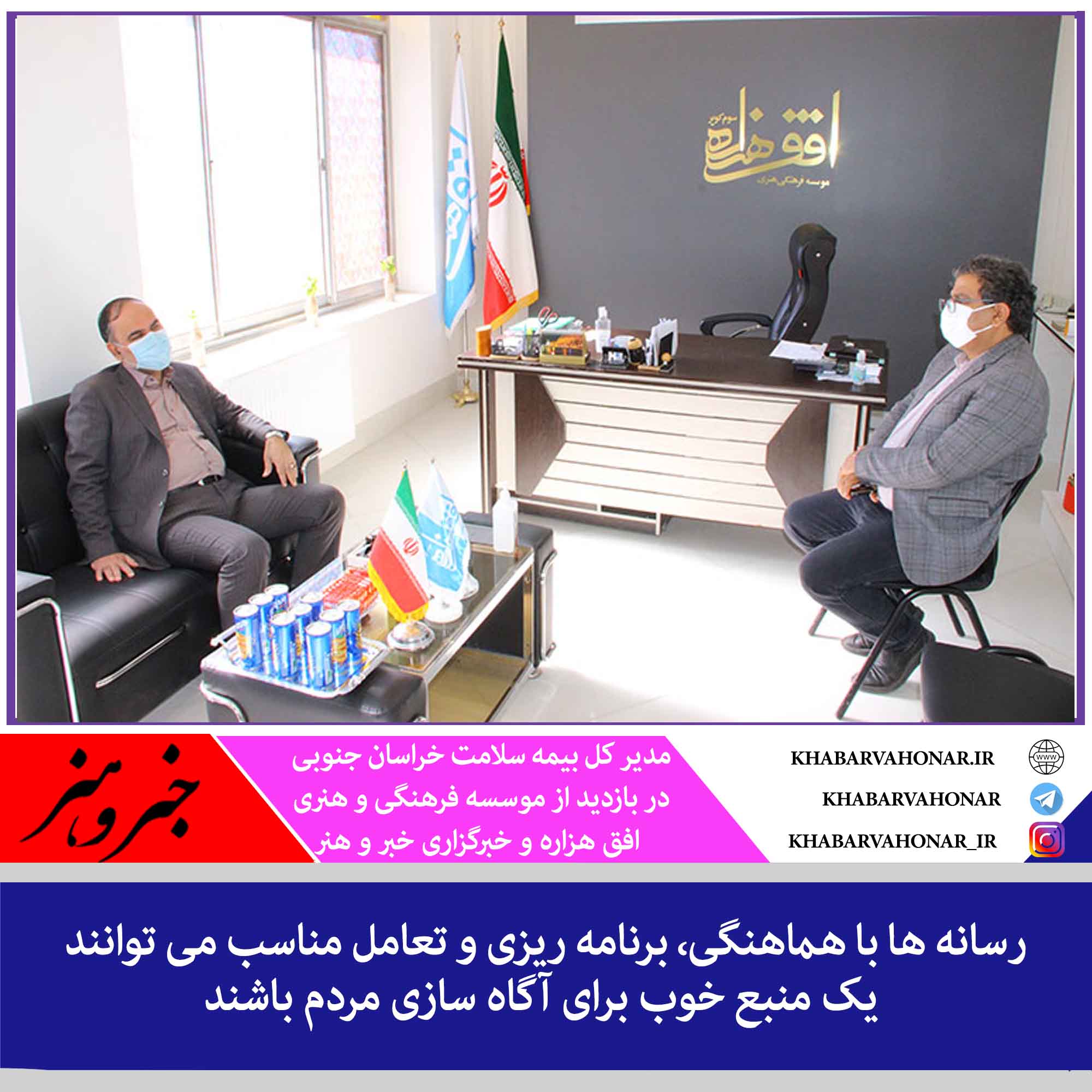 مدیر کل بیمه سلامت خراسان جنوبی در بازدید از موسسه فرهنگی و هنری افق هزاره و خبرگزاری خبر و هنر عنوان کرد : رسانه ها با هماهنگی، برنامه ریزی و تعامل مناسب می توانند یک منبع خوب برای آگاه سازی مردم باشند.