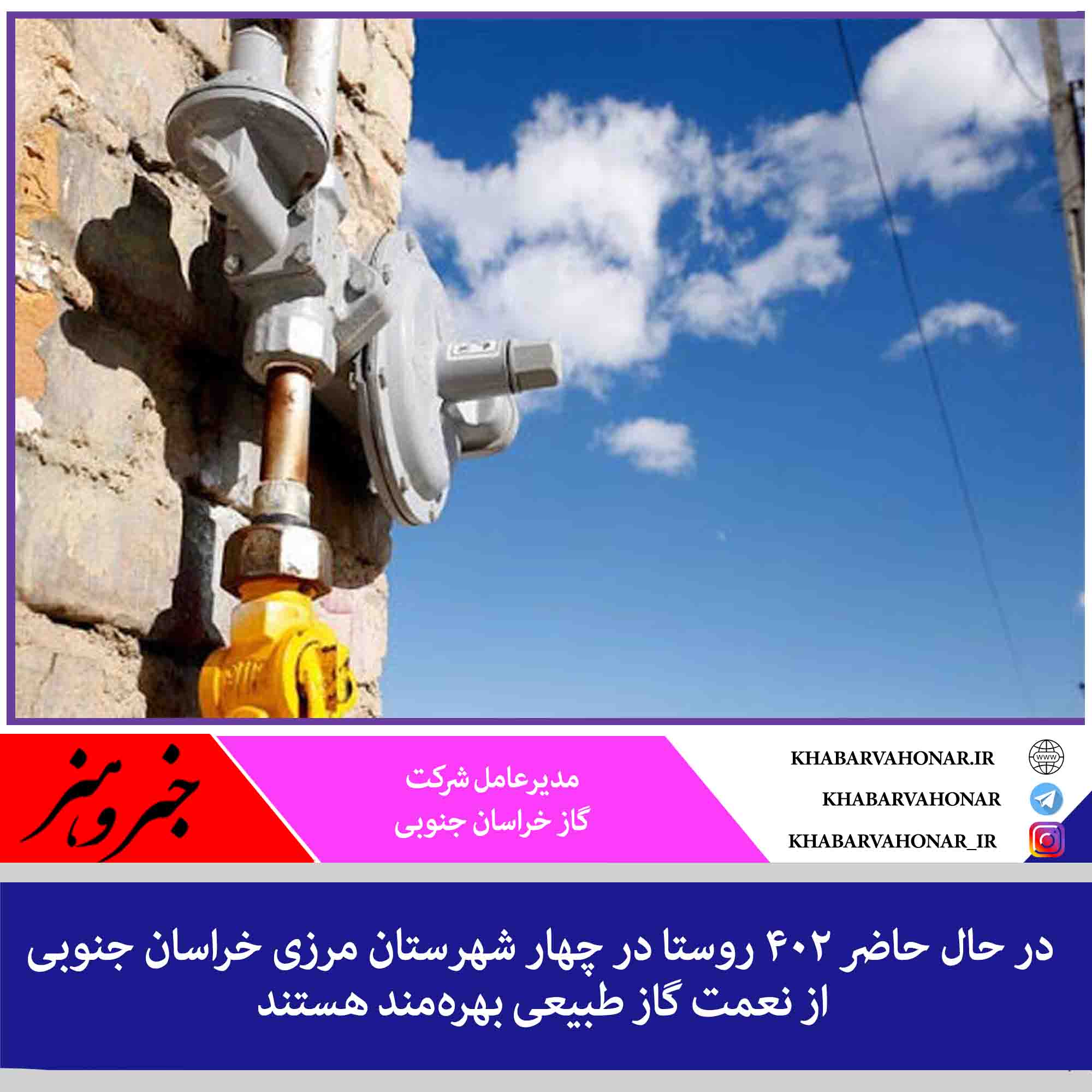 مدیرعامل شرکت گاز خراسان جنوبی گفت: در ادامه نهضت گازرسانی در خراسان جنوبی در حال حاضر ۴۰۲ روستا در چهار شهرستان مرزی خراسان جنوبی از نعمت گاز طبیعی بهرهمند هستند و گازرسانی به ۲۲۲ روستای دیگر نیز در این شهرستانهای مرزی در دست اجراست.