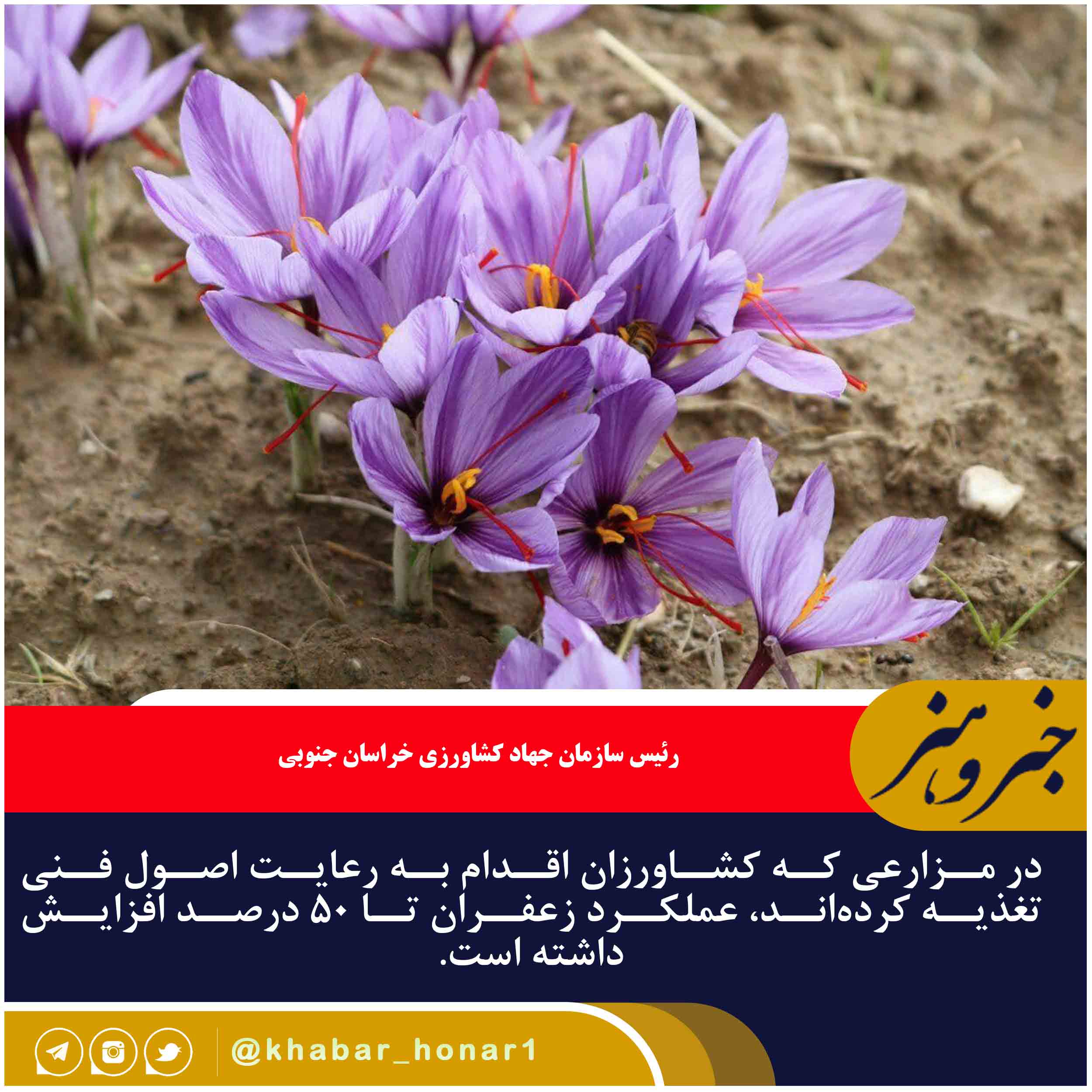 رئیس سازمان جهاد کشاورزی خراسان جنوبی گفت: در مزارعی که کشاورزان اقدام به رعایت اصول فنی تغذیه کردهاند، عملکرد زعفران تا ۵۰ درصد افزایش داشته است.