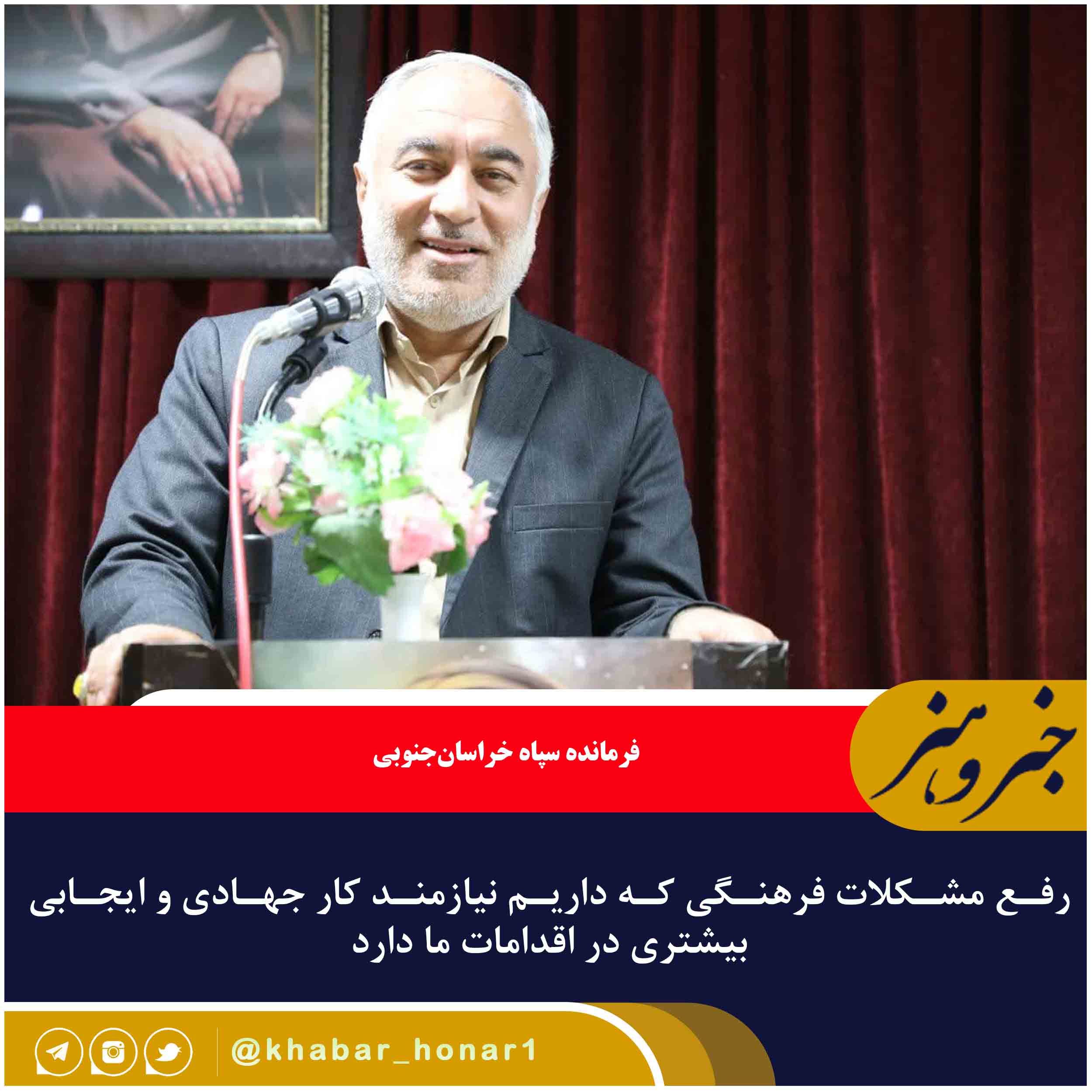 فرمانده سپاه خراسانجنوبی گفت: رفع مشکلات فرهنگی که داریم نیازمند کار جهادی و ایجابی بیشتری در اقدامات ما دارد.