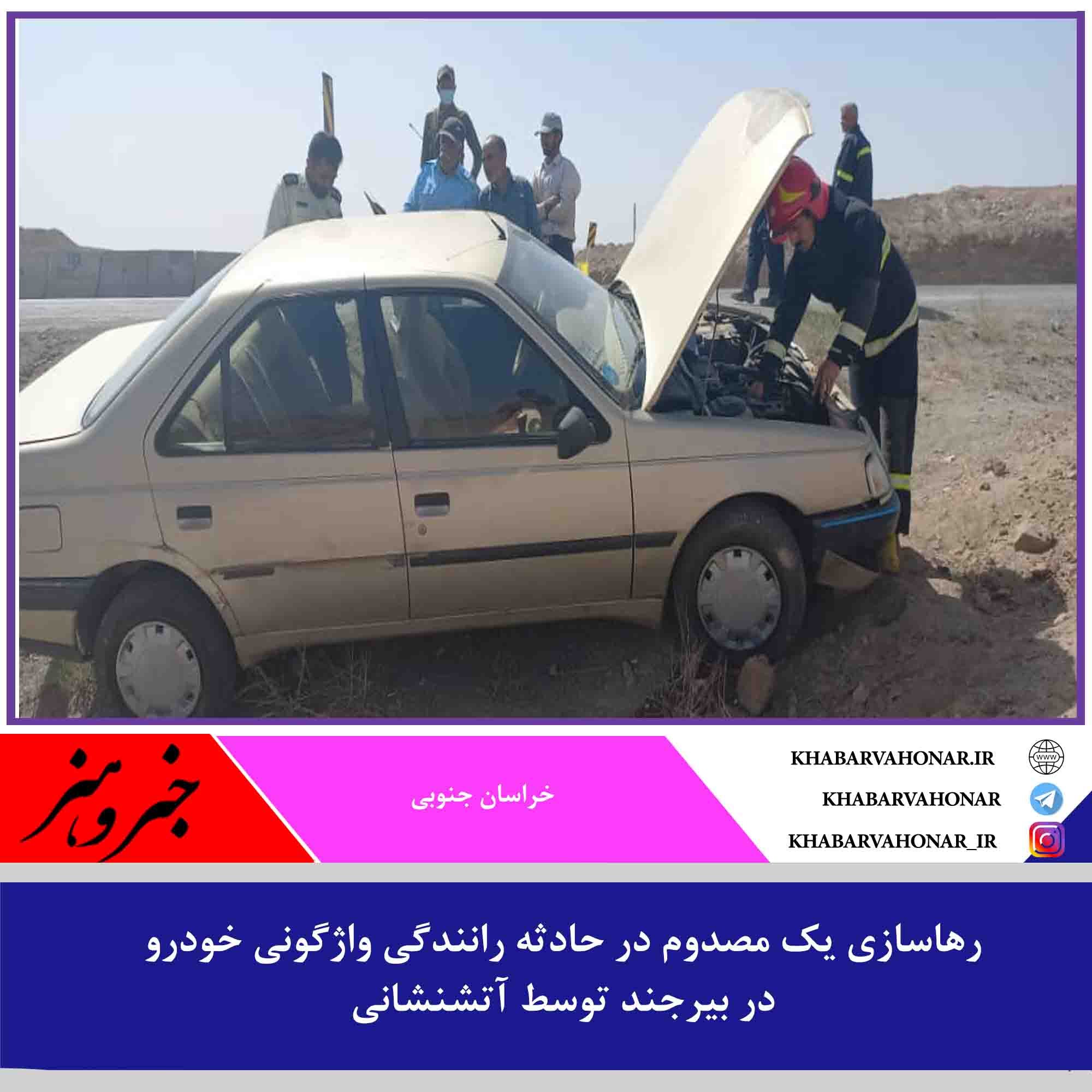 ساعت ۱۴ و ۴۱ دقیقه عصر امروز ۲۷ اردیبهشت با اعلام حادثه واژگونی خودرو پژو در کمربندی حدفاصل جاده زاهدان و فرودگاه و گیر کردن راننده خودرو ،تیم عملیاتی ایستگاه ۴ سازمان آتش نسانی بیرجند به محل اعزام شدند.