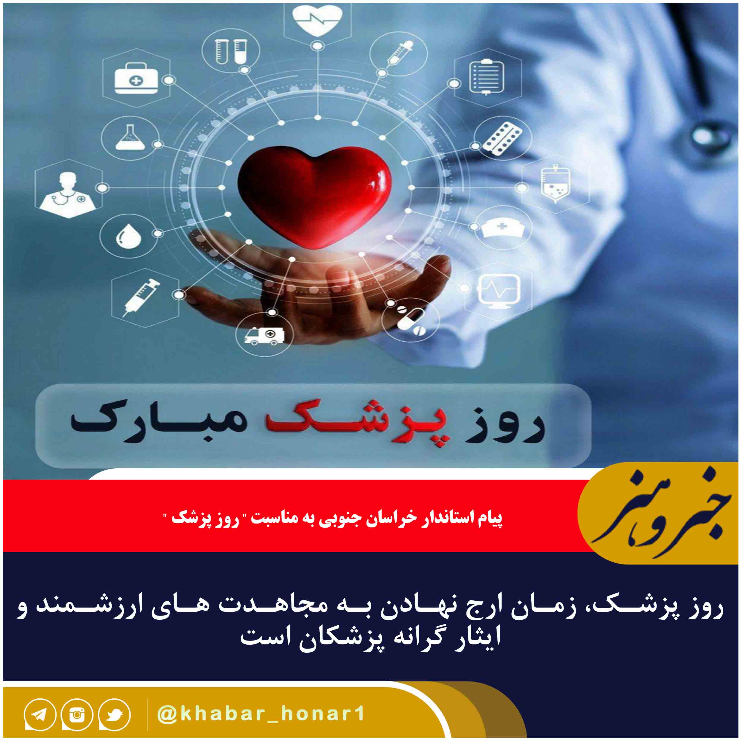 🔹اینجانب یکم شهریورماه، روز پزشک را به همه سپیدجامگان عرصه سلامت، به ویژه رئیس دانشگاه علوم پزشکی خراسان جنوبی و همه دست اندرکاران حوزه بهداشت و درمان استان، اعم از پزشکان، داروسازان، دانشجویان پزشکی،پرستاران و کارکنان مراکز درمانی تبریک و تهنیت گفته، با آرزوی توفیق و سربلندی برای همه مدافعان سلامت، از درگاه ایزد منان، عافیت و سلامتی را برای همه بیماران عزیز مسئلت دارم.