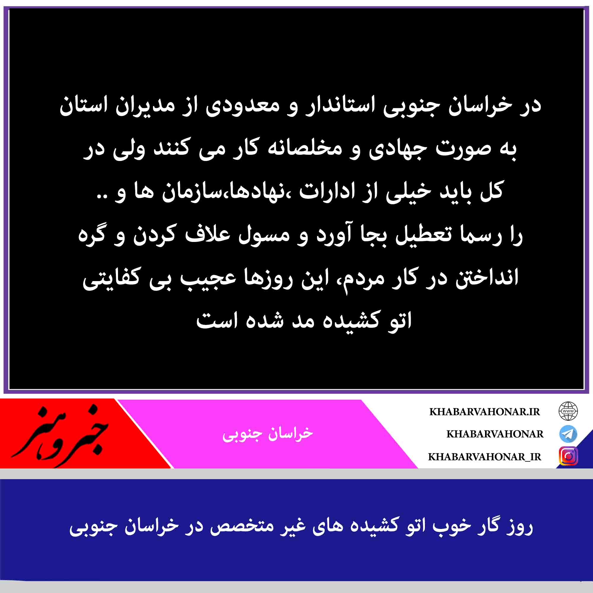 در خراسان جنوبی استاندار و معدودی از مدیران استان به صورت جهادی و مخلصانه کار می کنند ولی در کل باید خیلی از ادارات ،نهادها،سازمان ها و .. را رسما تعطیل بجا آورد و مسول علاف کردن و گره انداختن در کار مردم، این روزها عجیب بی کفایتی اتو کشیده مد شده است