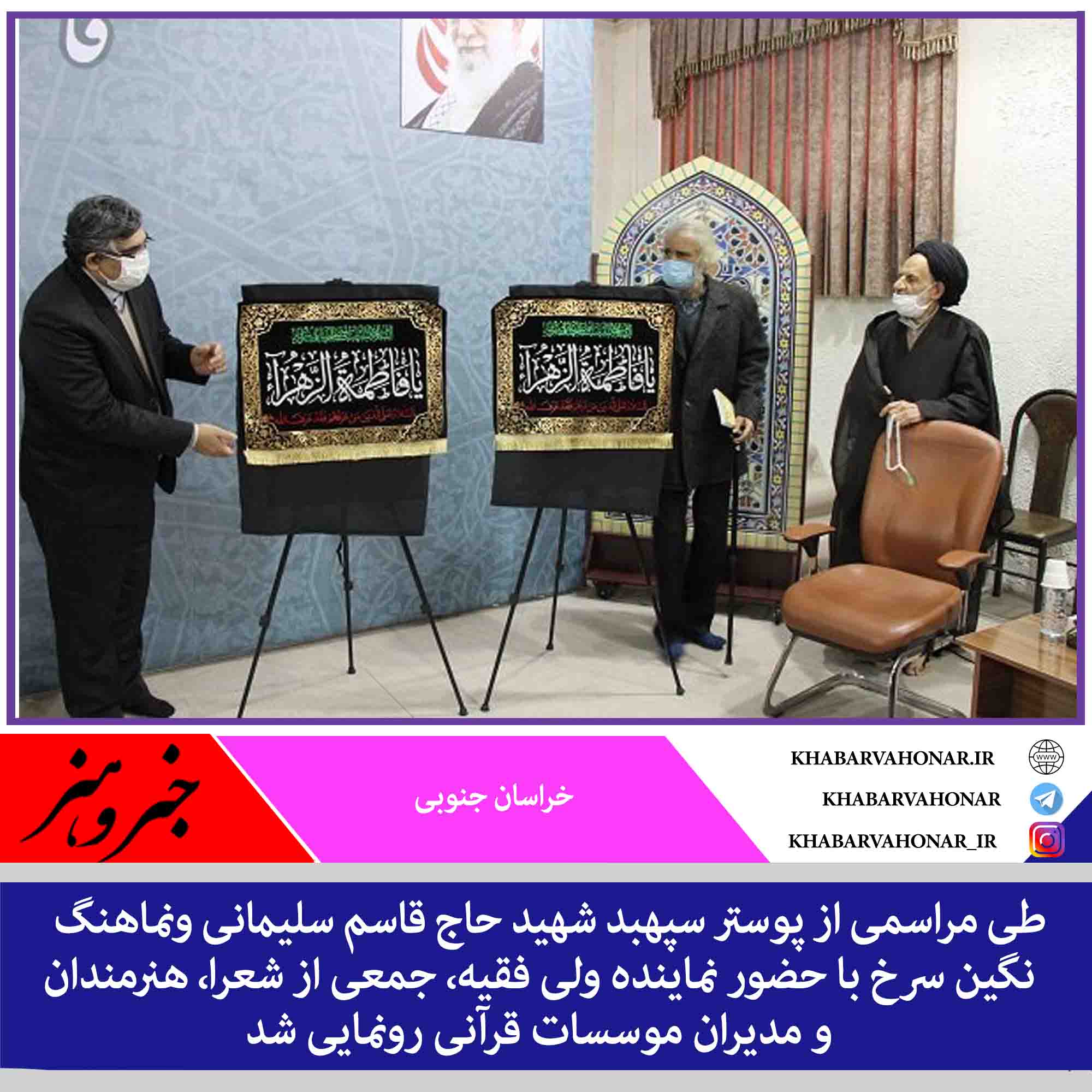 طی مراسمی از پوستر سپهبد شهید حاج قاسم سلیمانی و نماهنگ نگین سرخ با حضور نماینده ولی فقیه، جمعی از شعرا، هنرمندان و مدیران موسسات قرآنی رونمایی شد. مدیر کل فرهنگ و ارشاد اسلامی در این مراسم که صبح دوشنبه ۸ دی ماه جاری در دفتر نماینده ولی فقیه برگزار شد، ضمن تسلیت ایام شهادت حضرت زهرا (س) عنوان کرد: اداره کل فرهنگ و ارشاد اسلامی برنامه های متعددی را برای این ایام پیش بینی کرده است.