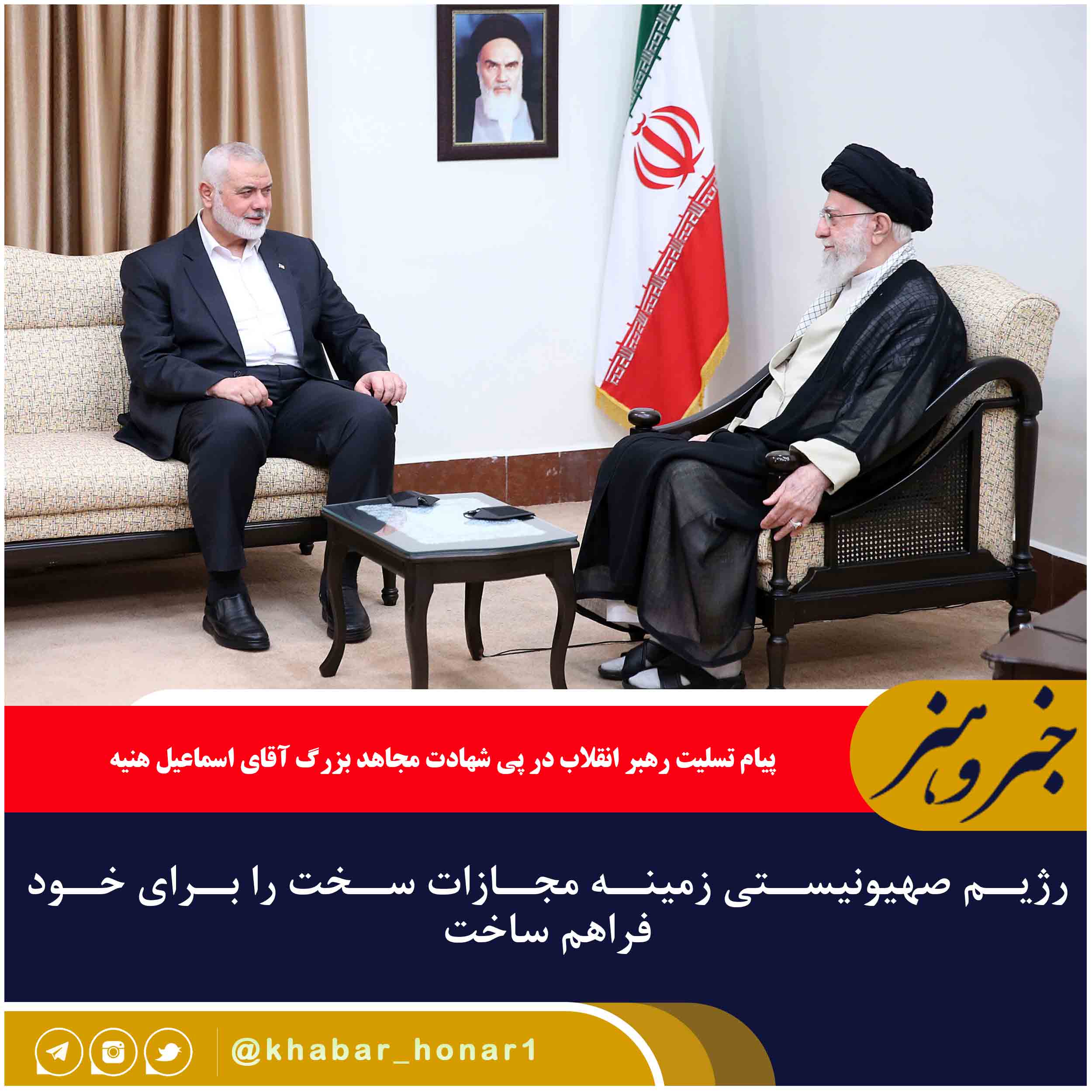 در پی شهادت مجاهد بزرگ آقای اسماعیل هنیه رئیس دفتر سیاسی حماس حضرت آیتالله خامنهای رهبر معظم انقلاب اسلامی در پیامی ضمن تسلیت شهادت این رهبر شجاع و مجاهد برجسته به امت اسلامی و جبهه مقاومت و ملت سرافراز فلسطین تاکید کردند: رژیم صهیونی جنایتکار و تروریست با این اقدام زمینهی مجازات سختی را برای خود فراهم ساخت و خونخواهی او را که در حریم جمهوری اسلامی ایران به شهادت رسید، وظیفه خود میدانیم.