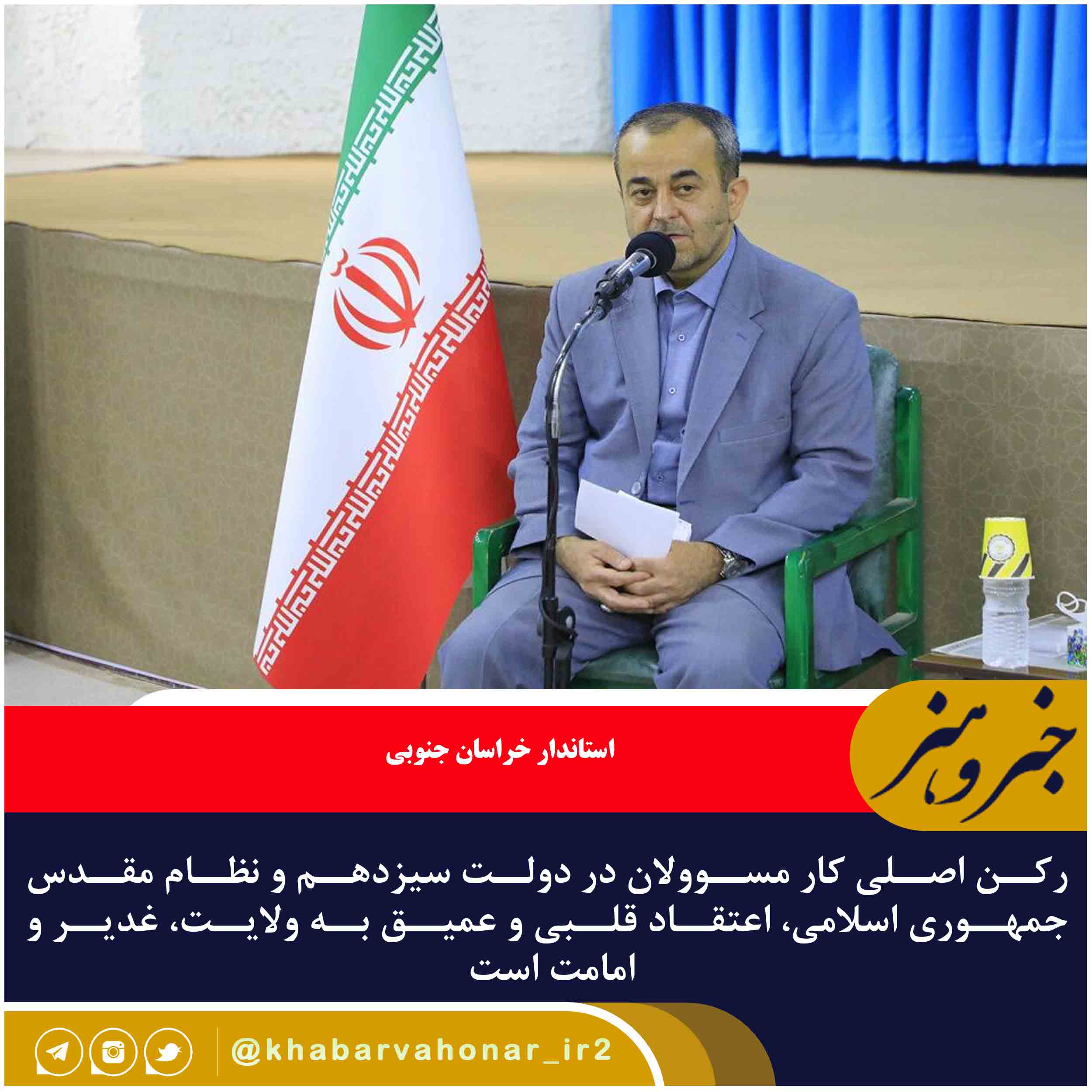 استاندار خراسان جنوبی گفت: رکن اصلی کار مسوولان در دولت سیزدهم و نظام مقدس جمهوری اسلامی، اعتقاد قلبی و عمیق به ولایت، غدیر و امامت است.