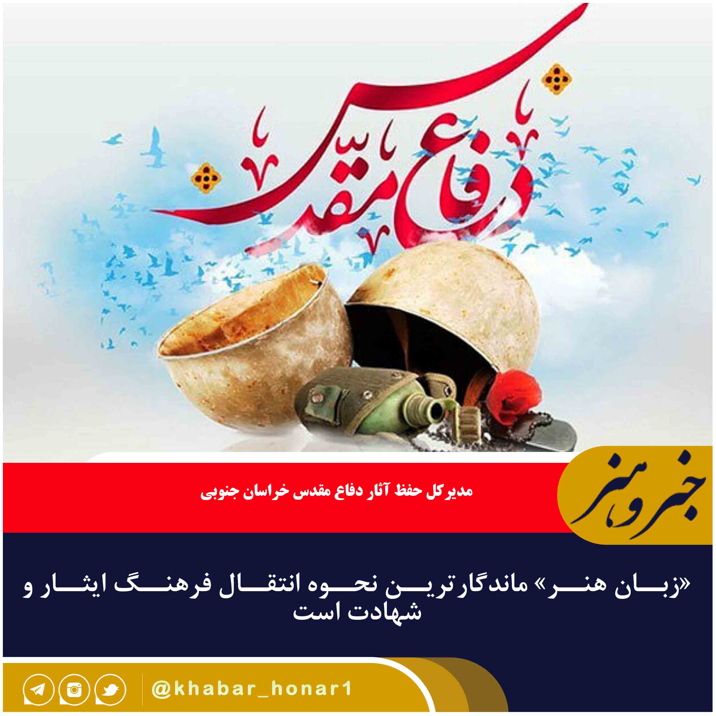 مدیرکل حفظ آثار دفاع مقدس خراسان جنوبی: ارسال ۵۰ اثر به جشنواره استانی شعر دفاع مقدس/ «زبان هنر» ماندگارترین نحوه انتقال فرهنگ ایثار و شهادت است سرهنگ «فلاحی» گفت: انتقال مفاهیم ایثار، جوانمردی، فداکاری و حماسه ازمدیرکل حفظ آثار دفاع مقدس خراسان جنوبی: ارسال ۵۰ اثر به جشنواره استانی شعر دفاع مقدس/ «زبان هنر» ماندگارترین نحوه انتقال فرهنگ ایثار و شهادت است سرهنگ «فلاحی» گفت: انتقال مفاهیم ایثار، جوانمردی، فداکاری و حماسه از وظایف اصلی شعر دفاع مقدس است و اگر این کار به درستی صورت بگیرد نقش مؤثری در ایجاد هویت انقلابی و حسینی در بین نسل جوان جامعه ما خواهد داشت.وی گفت: پیروزی انقلاب اسلامی در جنگ هشت ساله در شرایطی رخ داد که انقلاب ما مانند طفل تازه متولد شده بود؛ با توجه به اینکه با پیروزی انقلاب اسلامی، منافع دشمن در دوران رژیم شاهنشاهی از بین رفته بود، دشمن برای رسیدن به اهداف خود این جنگ را برنامهریزی و به ما تحمیل کرد.