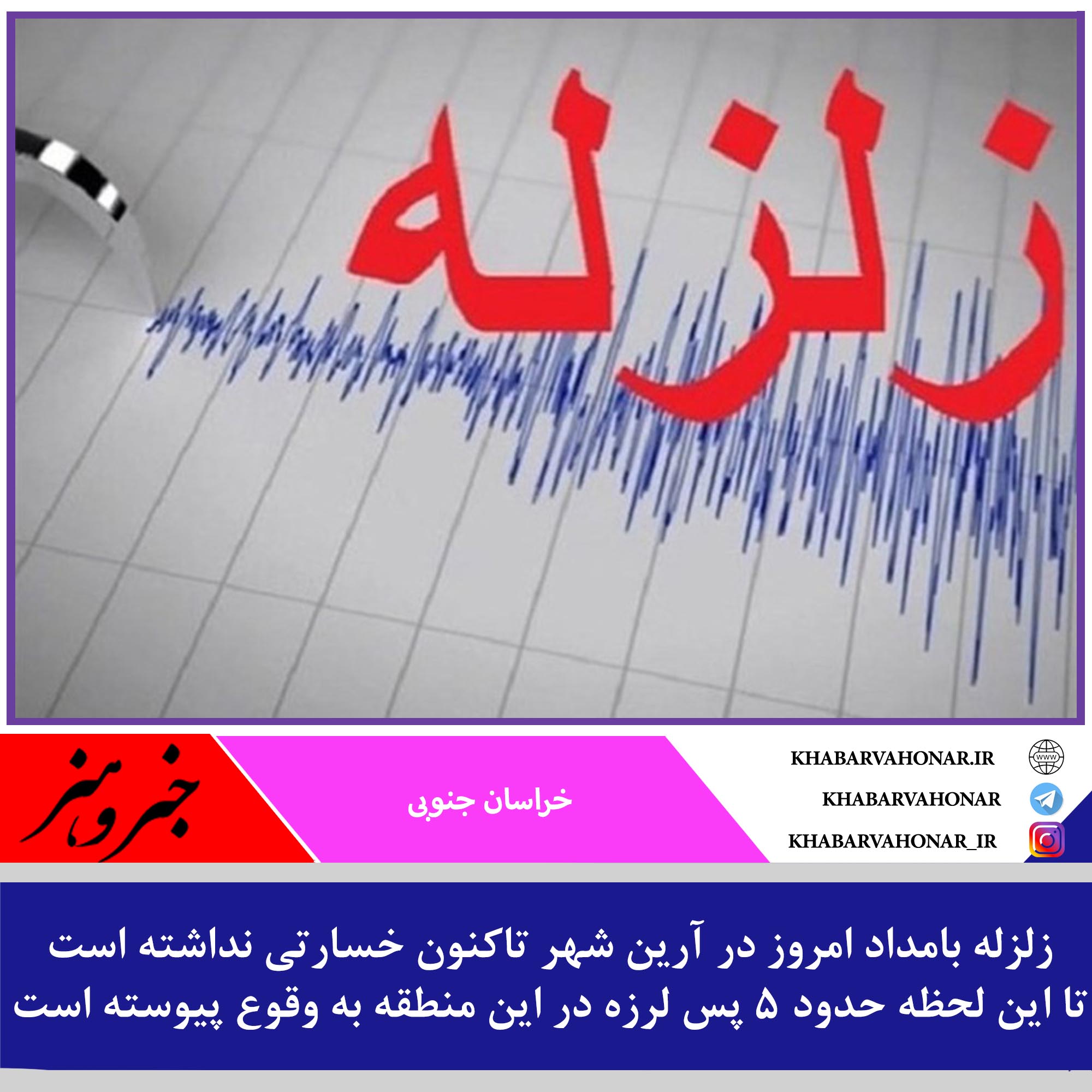 زلزله بامداد امروز در آرین شهر تاکنون خسارتی نداشته است به گفته اقای میرجلیلی مدیر کل مدیریت بحران استان چهار تیم ارزیاب به روستاهای اطراف کانون زلزله اعزام شدند
