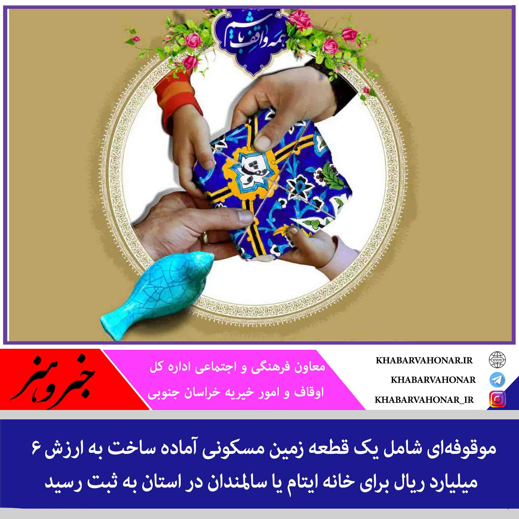 معاون فرهنگی و اجتماعی اداره کل اوقاف و امور خیریه خراسان جنوبی گفت: موقوفهای شامل یک قطعه زمین مسکونی آماده ساخت به ارزش ۶ میلیارد ریال برای خانه ایتام یا سالمندان در این استان به ثبت رسید.