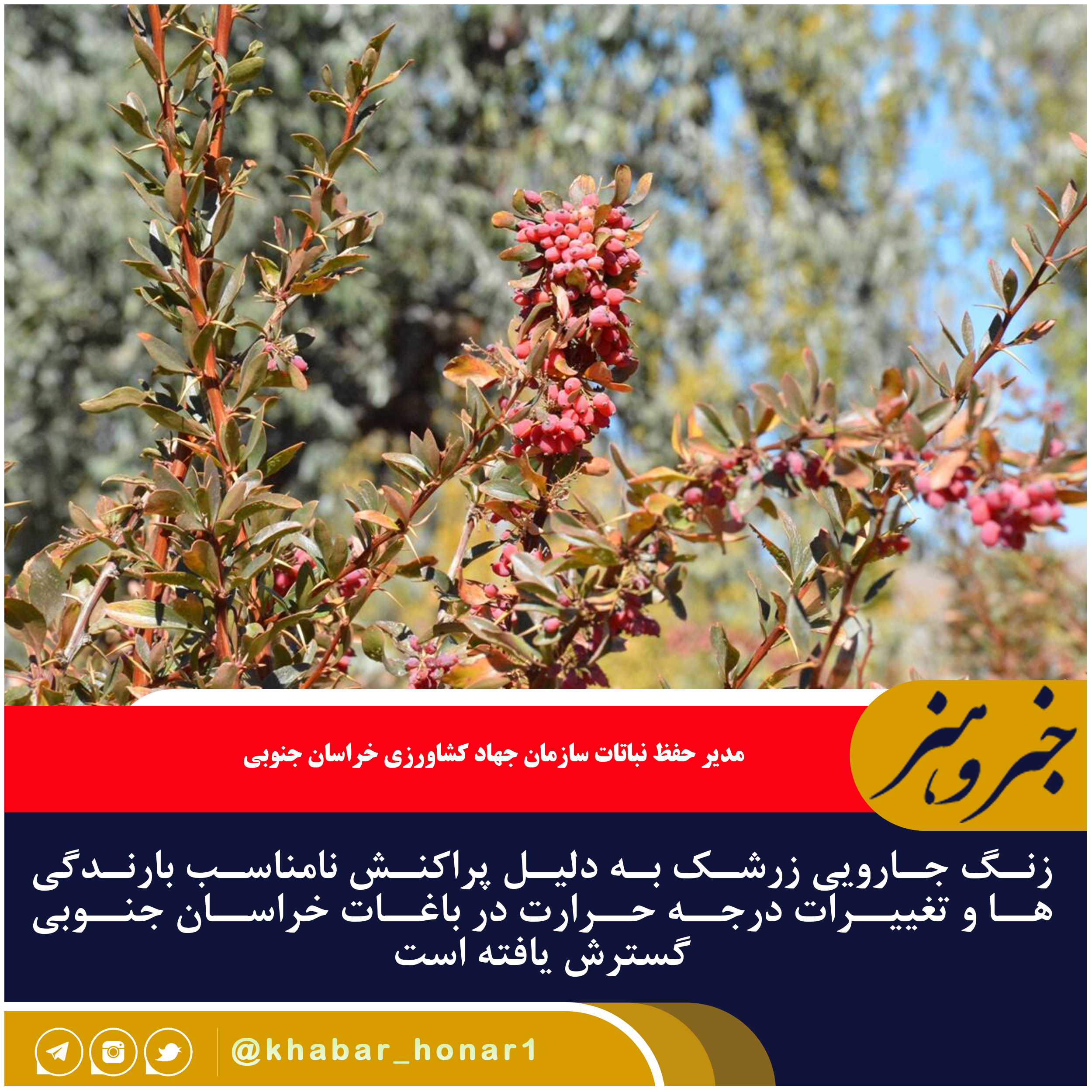 مدیر حفظ نباتات سازمان جهاد کشاورزی خراسان جنوبی گفت: بیماری زنگ جارویی زرشک در چند سال اخیر به دلایلی از جمله پراکنش نامناسب بارندگیها و تغییرات درجه حرارت در باغات استان گسترش یافته است.