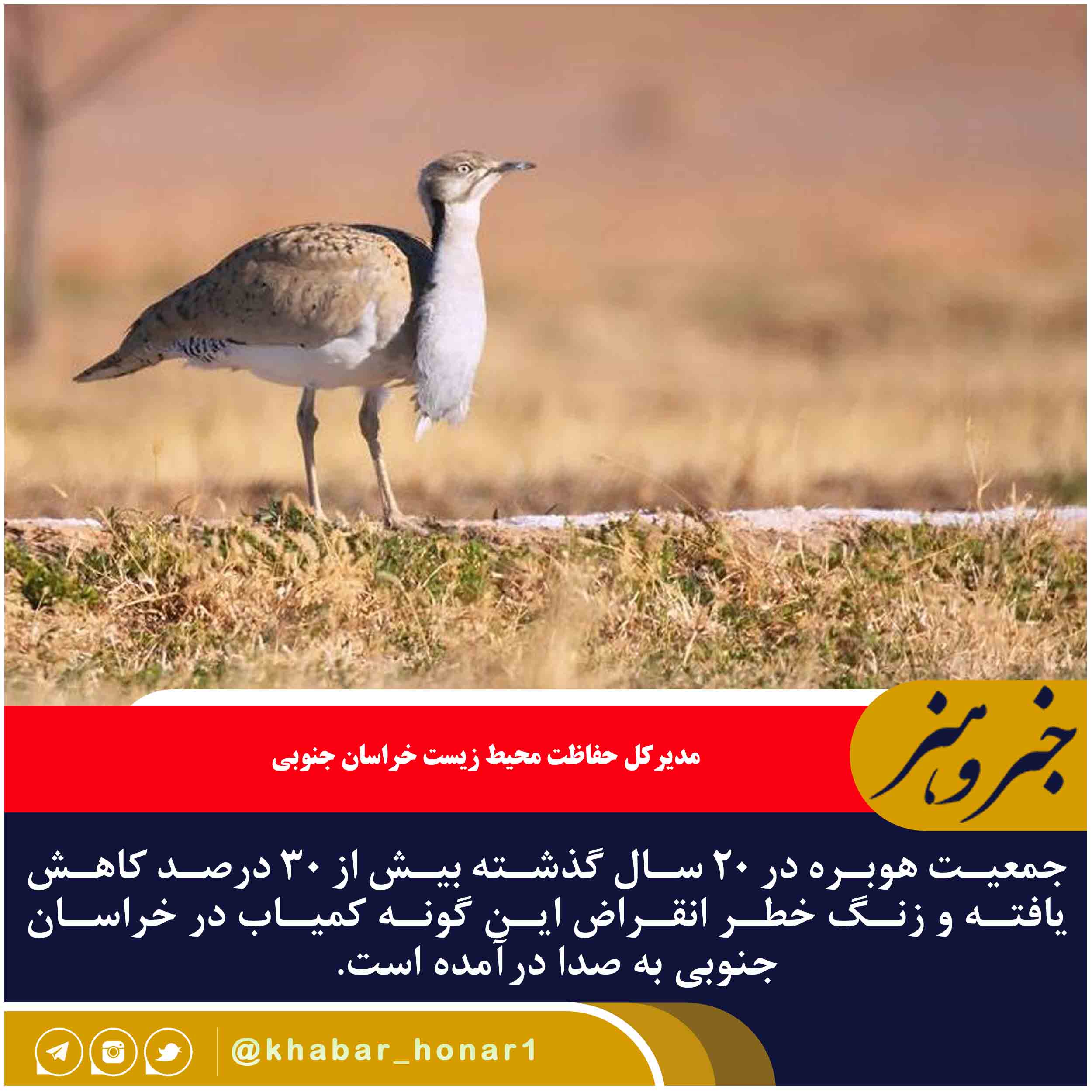 مدیرکل حفاظت محیط زیست خراسان جنوبی از به صدا درآمدن زنگ خطر انقراض این گونه در استان خبر داد و گفت: از جمله تهدیدات اصلی و بسیار مهم وارد به هوبره که زنگ خطری برای انقراض نه چندان دور آن در زیستگاهها محسوب میشود، حضور برخی افراد ناشناس، همکاری مردم بومی منطقه و اقدام به تلهگذاری وسیع در برخی زیستگاههای این گونه در خراسان جنوبی است.
