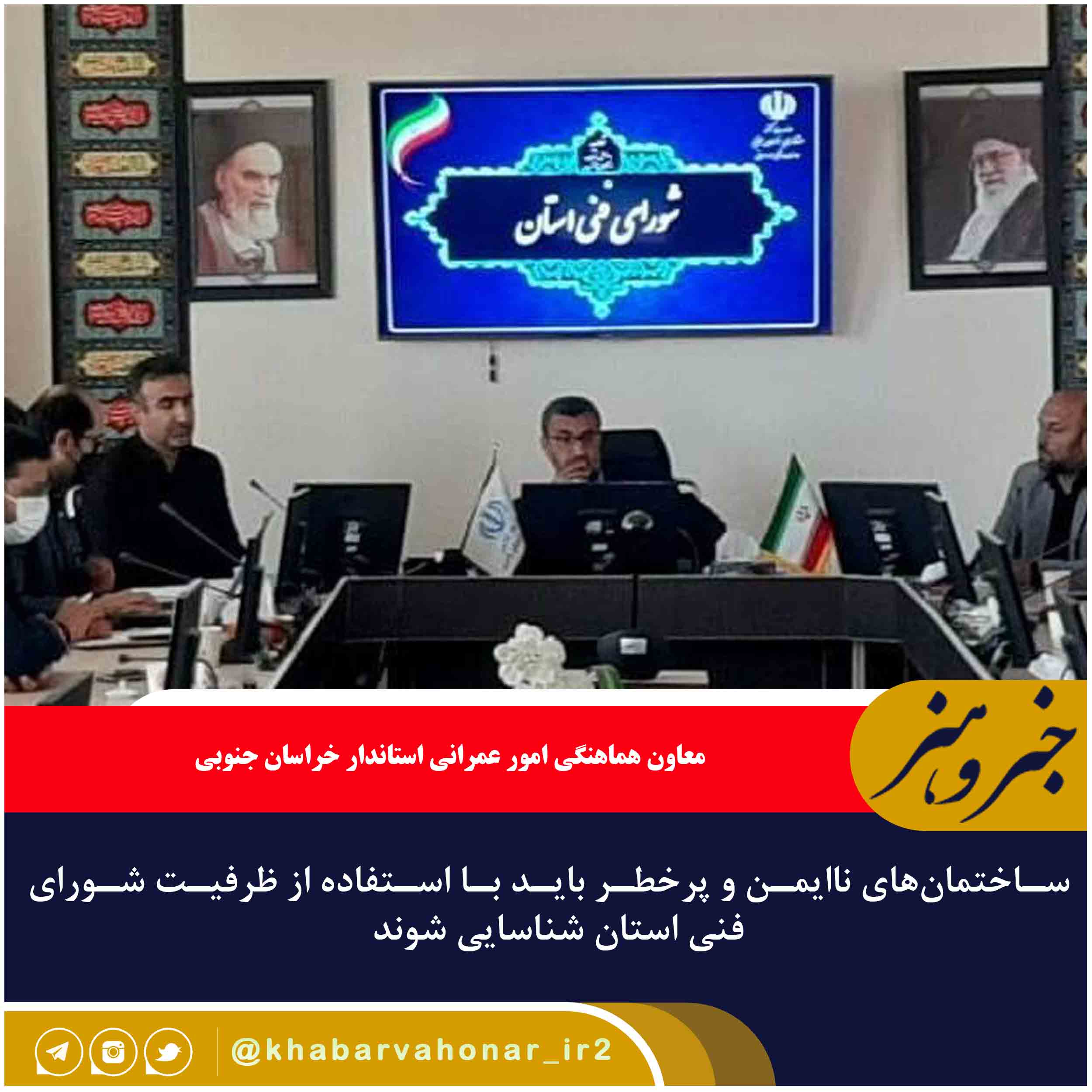 معاون هماهنگی امور عمرانی استاندار خراسان جنوبی گفت: ساختمانهای ناایمن و پرخطر باید با استفاده از ظرفیت شورای فنی استان شناسایی شوند و روند اجرای ساختمانهای بلندمرتبه در خراسان جنوبی بهویژه در شهر بیرجند مورد پایش قرار گیرد.