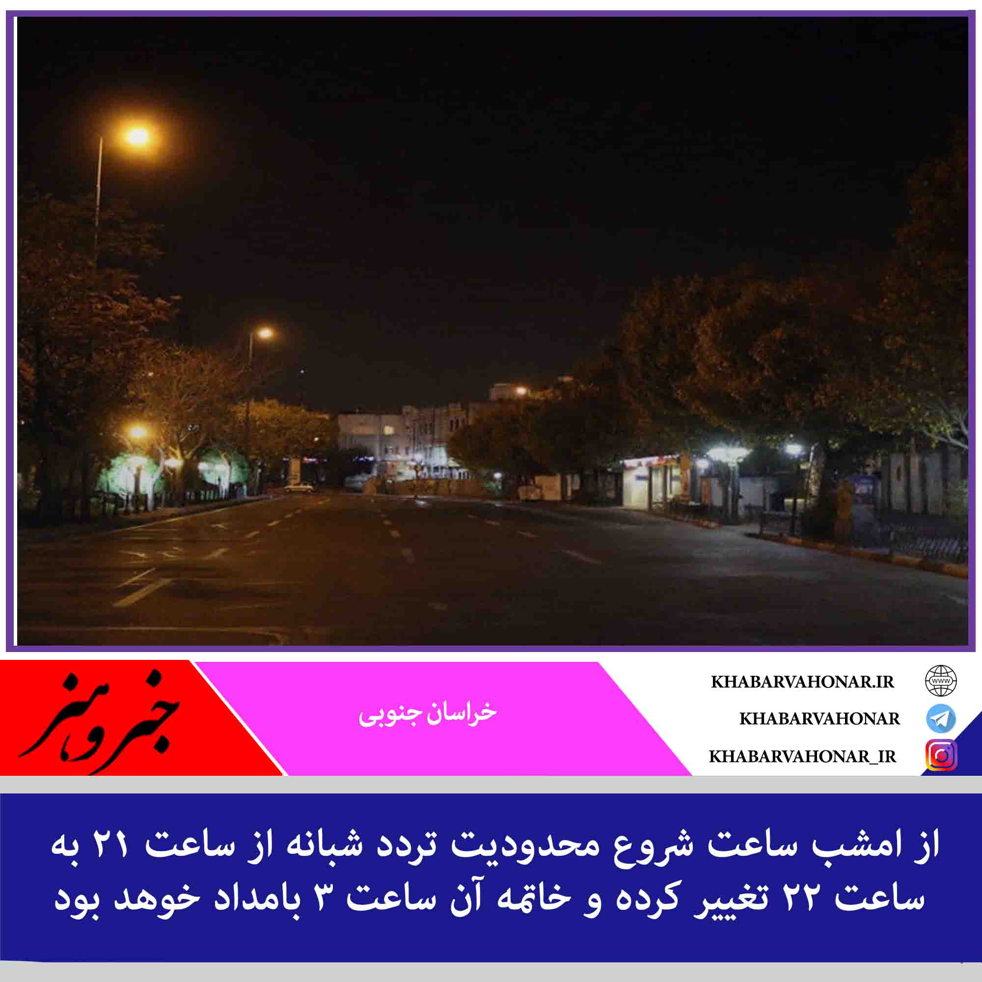 ?براساس مصوبه ستاد کرونا، از امشب ساعت شروع محدودیت تردد شبانه از ساعت ۲۱ به ساعت ۲۲ تغییر کرده و خاتمه آن ساعت ۳ بامداد خوهد بود.